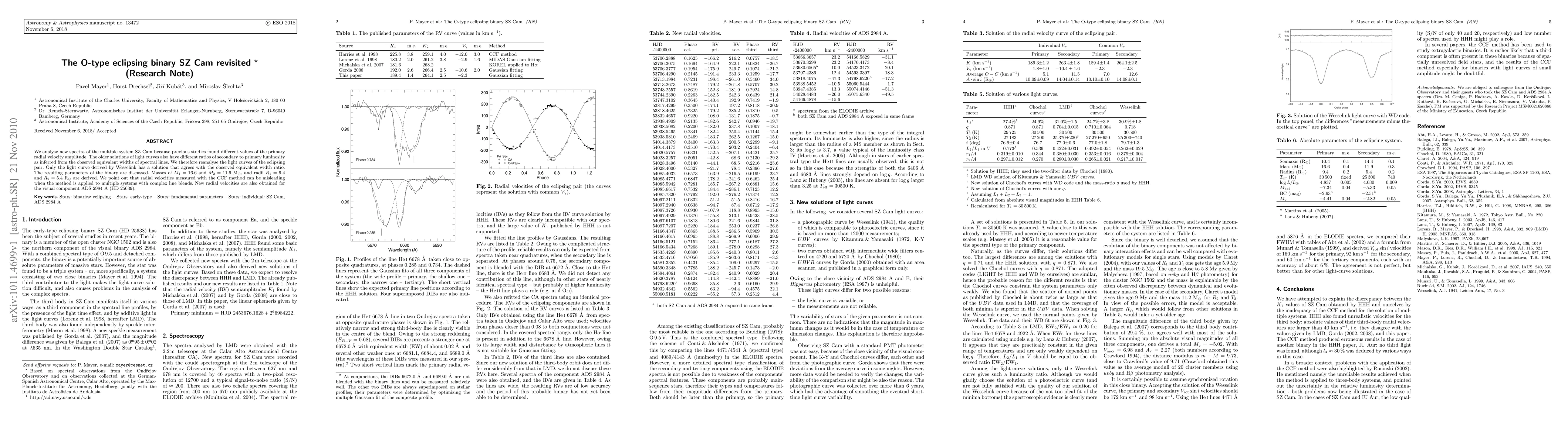 We analyse new spectra of the multiple system SZ Cam because previous studies found different values of the primary radial velocity amplitude. The older solutions of light curves also have different ratios of secondary to primary luminosity as inferred from the observed equivalent widths of spectral lines. We therefore reanalyse the light curves of the eclipsing pair. Only the light curve derived by Wesselink has a solution that agrees with the observed equivalent width ratio. The resulting parameters of the binary are discussed. Masses of $M_1=16.6$ and $M_2=11.9$ M$_{\odot}$, and radii $R_1=9.4$ and $R_2=5.4$ R$_{\odot}$ are derived. We point out that radial velocities measured with the CCF method can be misleading when the method is applied to multiple systems with complex line blends. New radial velocities are also obtained for the visual component ADS 2984 A (HD 25639).