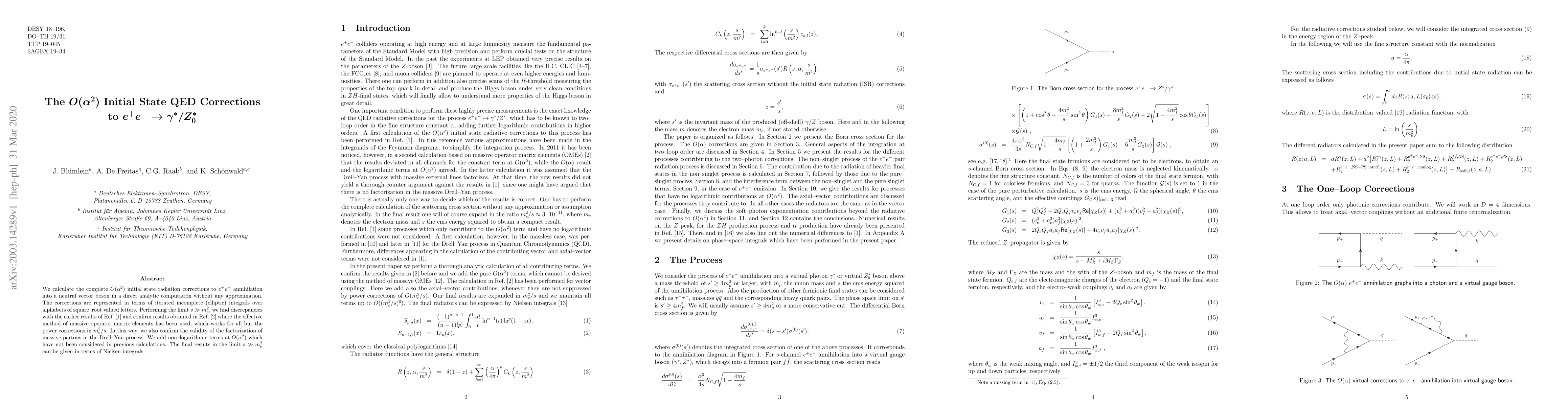 We calculate the complete $O(\alpha^2)$ initial state radiation corrections to $e^+ e^-$ annihilation into a neutral vector boson in a direct analytic computation without any approximation. The corrections are represented in terms of iterated incomplete (elliptic) integrals over alphabets of square--root valued letters. Performing the limit $s \gg m_e^2$, we find discrepancies with the earlier results of Ref.~\cite{Berends:1987ab} and confirm results obtained in Ref.~\cite{Blumlein:2011mi} where the effective method of massive operator matrix elements has been used, which works for all but the power corrections in $m^2_e/s$. In this way, we also confirm the validity of the factorization of massive partons in the Drell--Yan process. We add non--logarithmic terms at $O(\alpha^2)$ which have not been considered in previous calculations. The final results in the limit $s \gg m_e^2$ can be given in terms of Nielsen integrals.