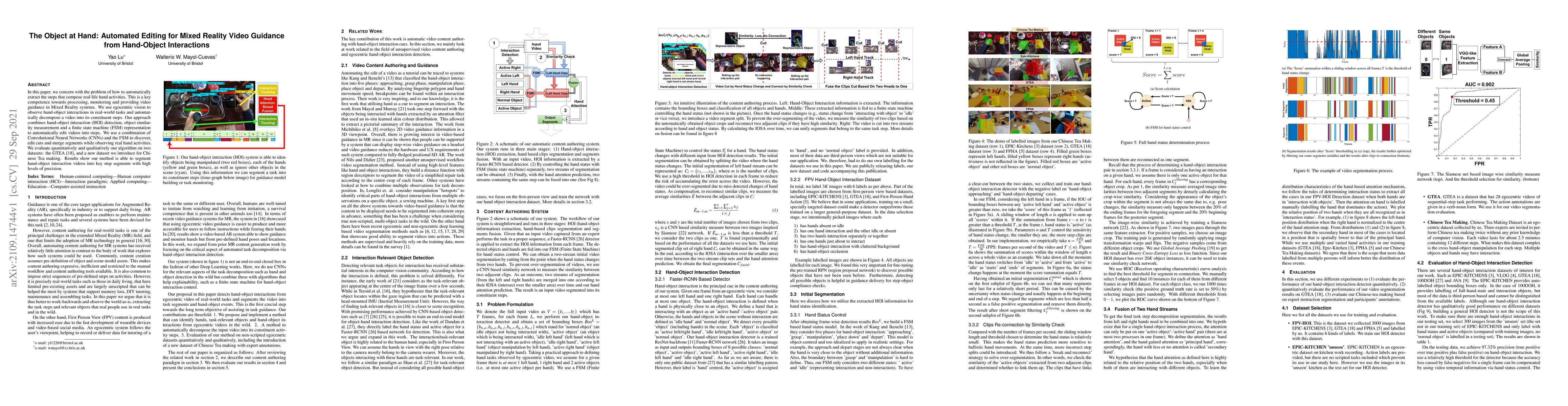 This paper presents an automated editing system for mixed reality video guidance based on hand-object interactions, using egocentric vision to detect and segment real-life hand activities into key steps. The method combines HOI detection, object similarity measurement, and a finite state machine to refine video edits, evaluated with high precision on GTEA and a new Chinese Tea making dataset.