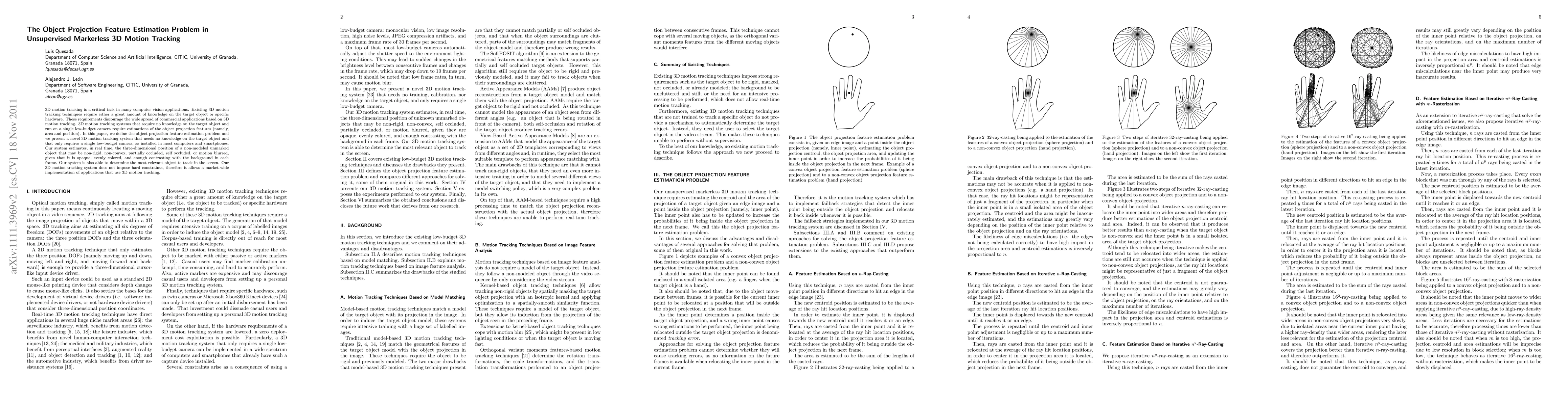 3D motion tracking is a critical task in many computer vision applications. Existing 3D motion tracking techniques require either a great amount of knowledge on the target object or specific hardware. These requirements discourage the wide spread of commercial applications based on 3D motion tracking. 3D motion tracking systems that require no knowledge on the target object and run on a single low-budget camera require estimations of the object projection features (namely, area and position). In this paper, we define the object projection feature estimation problem and we present a novel 3D motion tracking system that needs no knowledge on the target object and that only requires a single low-budget camera, as installed in most computers and smartphones. Our system estimates, in real time, the three-dimensional position of a non-modeled unmarked object that may be non-rigid, non-convex, partially occluded, self occluded, or motion blurred, given that it is opaque, evenly colored, and enough contrasting with the background in each frame. Our system is also able to determine the most relevant object to track in the screen. Our 3D motion tracking system does not impose hard constraints, therefore it allows a market-wide implementation of applications that use 3D motion tracking.