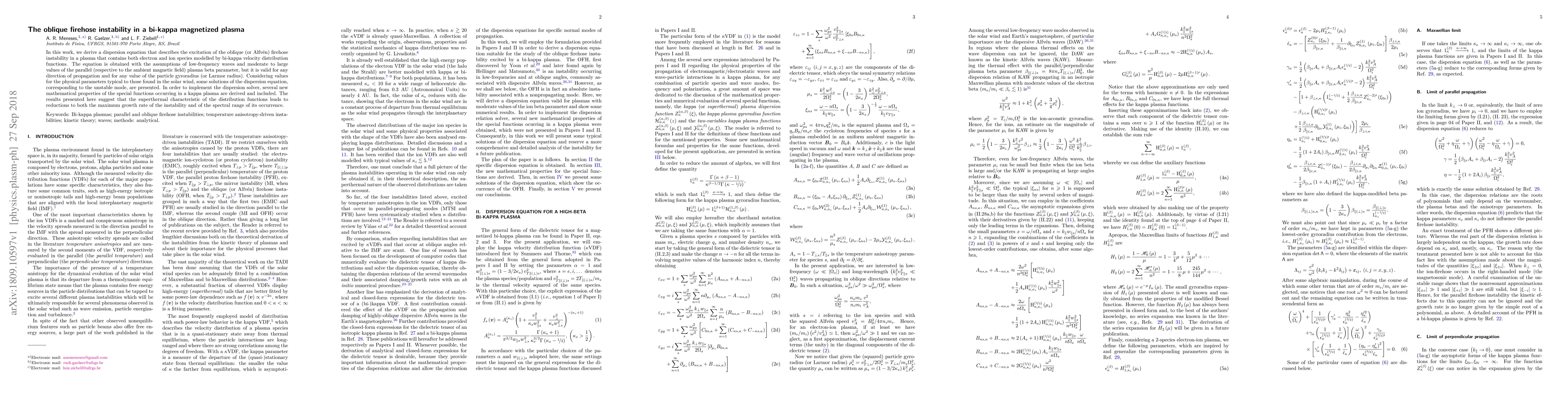 This paper derives a dispersion equation for the oblique firehose instability in bi-kappa magnetized plasmas, revealing that superthermal distribution functions reduce the instability's maximum growth rate and spectral range. New mathematical properties of special functions in kappa plasmas are developed to implement the dispersion solver.