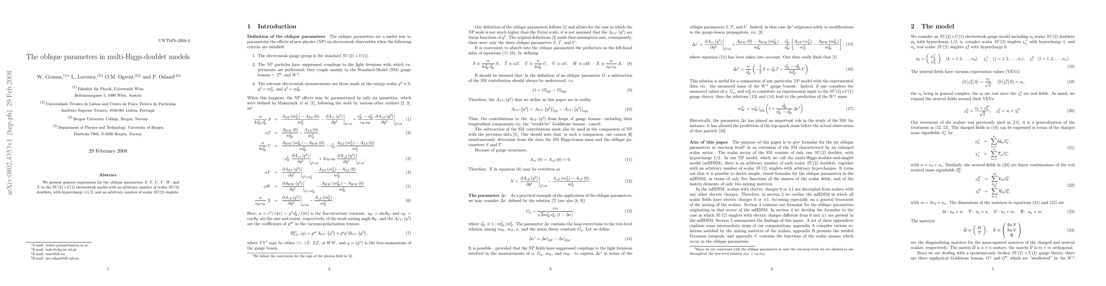 We present general expressions for the oblique parameters S, T, U, V, W, and X in the SU(2)xU(1) electroweak model with an arbitrary number of scalar SU(2) doublets, with hypercharge 1/2, and an arbitrary number of scalar SU(2) singlets.