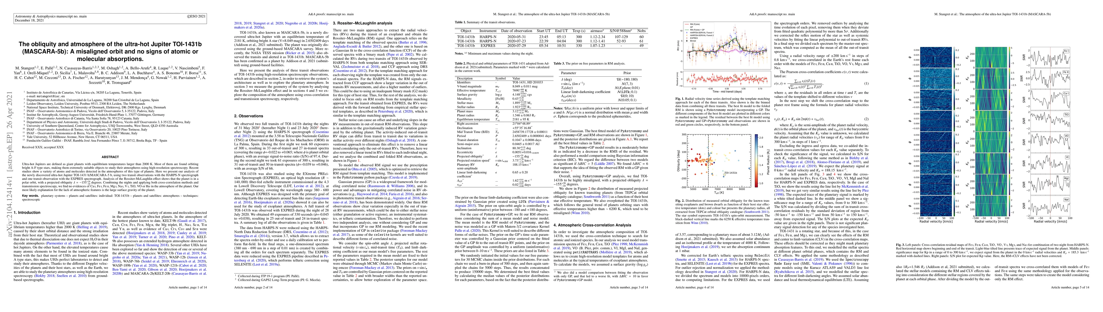 Ultra-hot Jupiters are defined as giant planets with equilibrium temperatures larger than 2000 K. Most of them are found orbiting bright A-F type stars, making them extremely suitable objects to study their atmospheres using high-resolution spectroscopy. Recent studies show a variety of atoms and molecules detected in the atmospheres of this type of planets. Here we present our analysis of the newly discovered ultra-hot Jupiter TOI-1431b/MASCARA-5b, using two transit observations with the HARPS-N spectrograph and one transit observation with the EXPRES spectrograph. Analysis of the Rossiter-McLaughlin effect shows that the planet is in a polar orbit, with a projected obliquity $ \lambda = -155^{+20}_{-10}$ degrees. Combining the nights and applying both cross-correlation methods and transmission spectroscopy, we find no evidences of CaI, FeI, FeII, MgI, NaI, VI, TiO, VO or H$\alpha$ in the atmosphere of the planet. Our most likely explanation for the lack of atmospheric features is the large surface gravity of the planet.