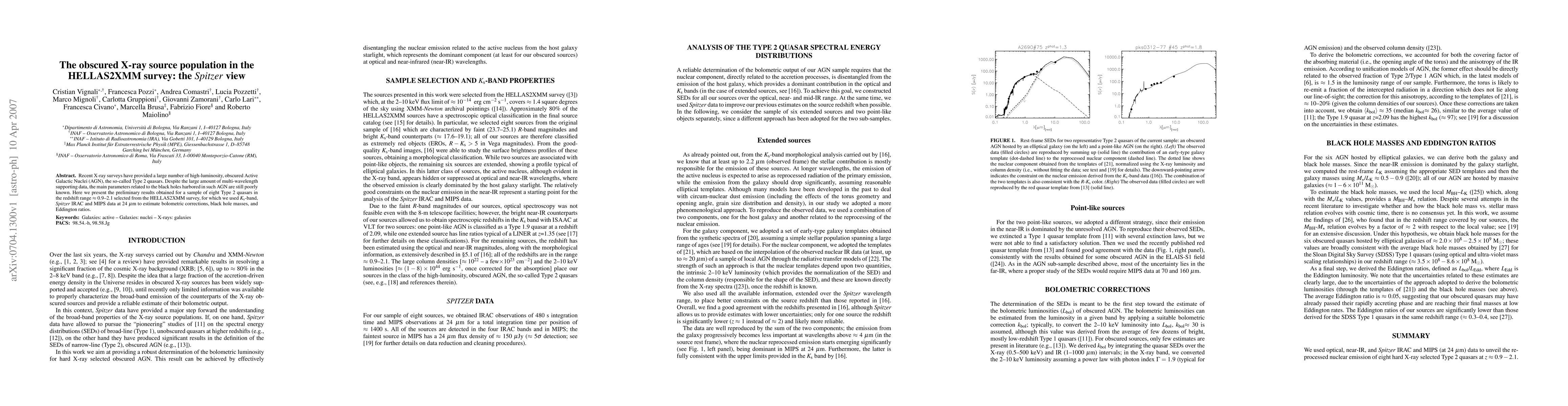 Recent X-ray surveys have provided a large number of high-luminosity, obscured Active Galactic Nuclei (AGN), the so-called Type 2 quasars. Despite the large amount of multi-wavelength supporting data, the main parameters related to the black holes harbored in such AGN are still poorly known. Here we present the results obtained for a sample of eight Type 2 quasars in the redshift range 0.9-2.1 selected from the HELLAS2XMM survey, for which we used Ks-band, Spitzer IRAC and MIPS data at 24 micron to estimate bolometric corrections, black hole masses, and Eddington ratios.