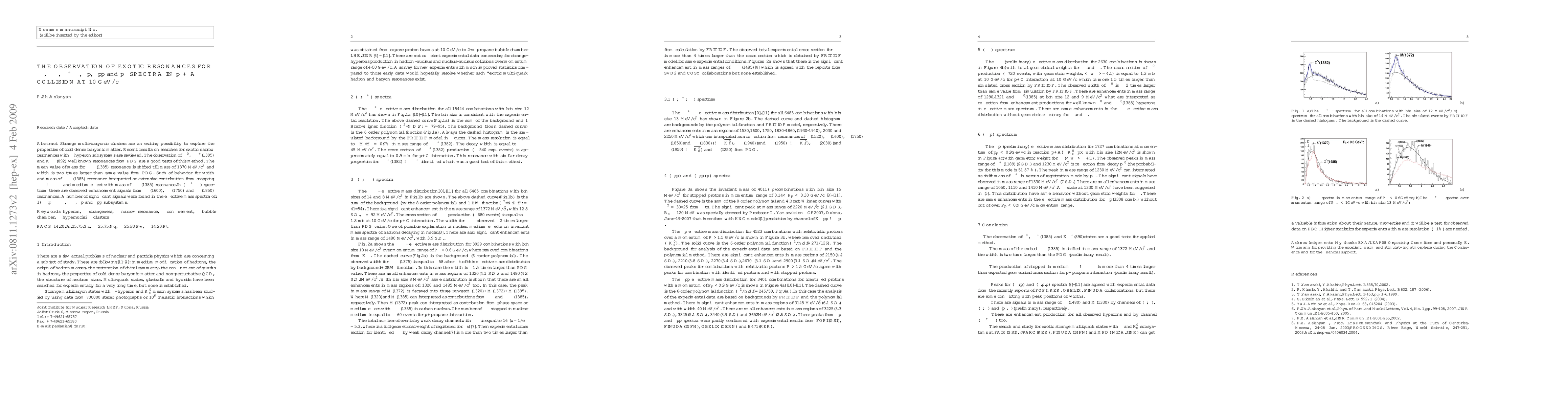 Researchers observed exotic resonances in particle collisions, including unusual mass shifts and widths for known and unknown particles, offering insights into cold dense baryonic matter properties.