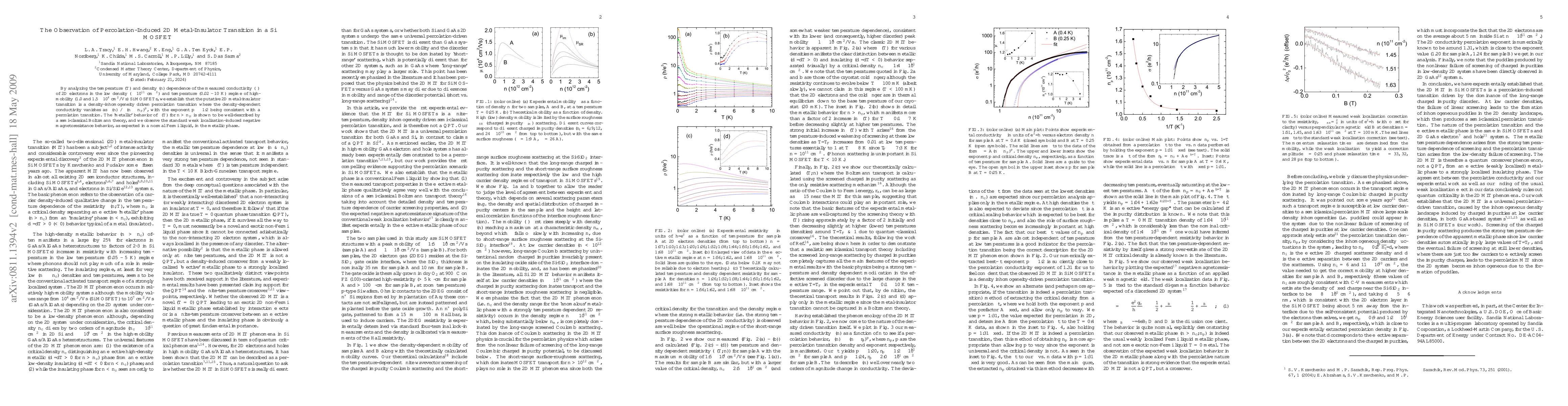 This study observes a percolation-induced 2D metal-insulator transition in Si MOSFETs at low electron densities and temperatures, demonstrating that conductivity vanishes with a density-dependent exponent consistent with percolation theory. The metallic behavior is well-explained by semi-classical Boltzmann theory, and weak localization-induced magnetoresistance is observed in the metallic phase.