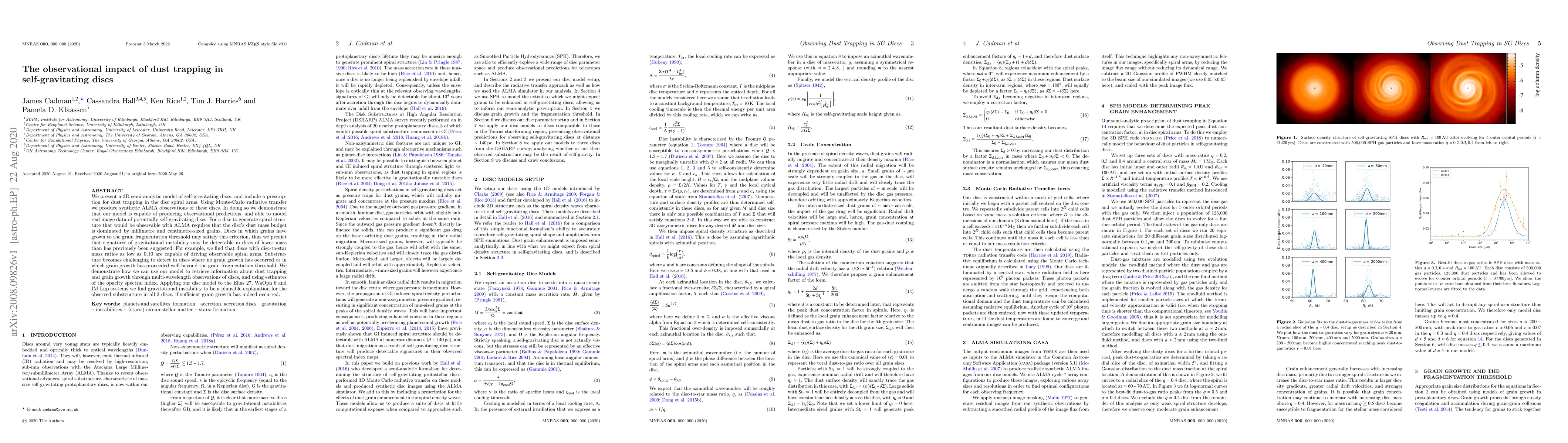 We present a 3D semi-analytic model of self-gravitating discs, and include a prescription for dust trapping in the disc spiral arms. Using Monte-Carlo radiative transfer we produce synthetic ALMA observations of these discs. In doing so we demonstrate that our model is capable of producing observational predictions, and able to model real image data of potentially self-gravitating discs. For a disc to generate spiral structure that would be observable with ALMA requires that the disc's dust mass budget is dominated by millimetre and centimetre-sized grains. Discs in which grains have grown to the grain fragmentation threshold may satisfy this criterion, thus we predict that signatures of gravitational instability may be detectable in discs of lower mass than has previously been suggested. For example, we find that discs with disc-to-star mass ratios as low as $0.10$ are capable of driving observable spiral arms. Substructure becomes challenging to detect in discs where no grain growth has occurred or in which grain growth has proceeded well beyond the grain fragmentation threshold. We demonstrate how we can use our model to retrieve information about dust trapping and grain growth through multi-wavelength observations of discs, and using estimates of the opacity spectral index. Applying our disc model to the Elias 27, WaOph 6 and IM Lup systems we find gravitational instability to be a plausible explanation for the observed substructure in all 3 discs, if sufficient grain growth has indeed occurred.