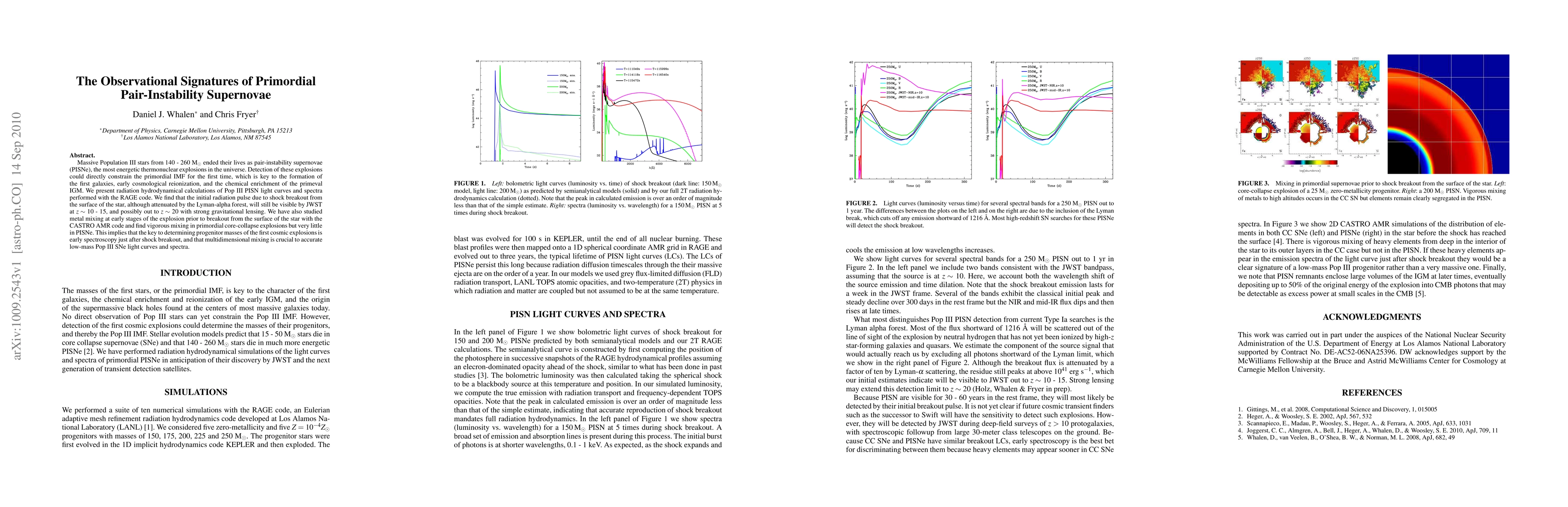 The paper presents detailed radiation hydrodynamical calculations of Population III PISN light curves and spectra using the RAGE code, along with metal mixing analysis using the CASTRO AMR code.
