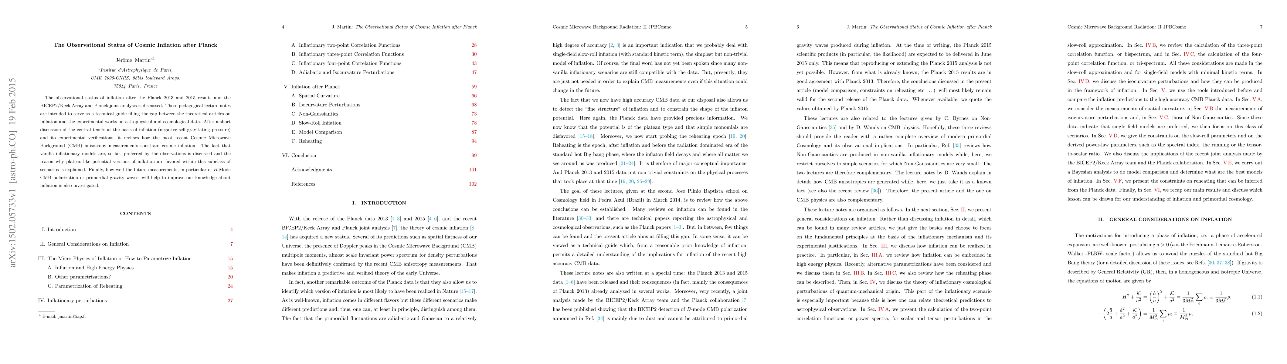 The observational status of inflation after the Planck 2013 and 2015 results and the BICEP2/Keck Array and Planck joint analysis is discussed. These pedagogical lecture notes are intended to serve as a technical guide filling the gap between the theoretical articles on inflation and the experimental works on astrophysical and cosmological data. After a short discussion of the central tenets at the basis of inflation (negative self-gravitating pressure) and its experimental verifications, it reviews how the most recent Cosmic Microwave Background (CMB) anisotropy measurements constrain cosmic inflation. The fact that vanilla inflationary models are, so far, preferred by the observations is discussed and the reason why plateau-like potential versions of inflation are favored within this subclass of scenarios is explained. Finally, how well the future measurements, in particular of $B$-Mode CMB polarization or primordial gravity waves, will help to improve our knowledge about inflation is also investigated.