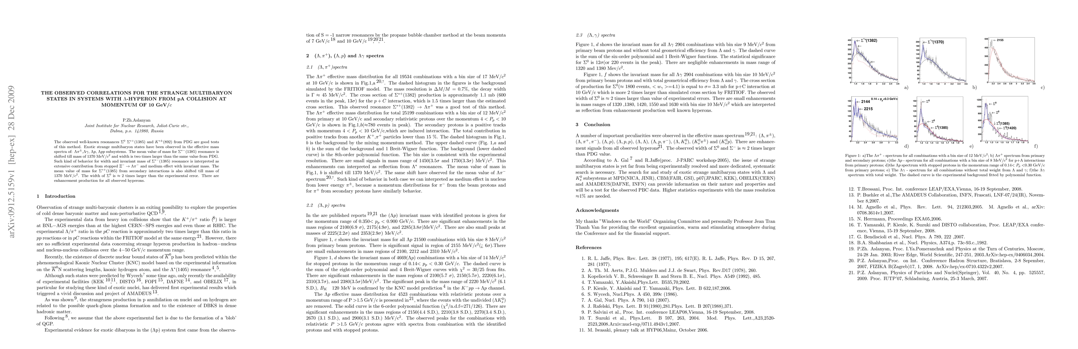 he observed well-known resonances $\Sigma^0$ $\Sigma^{*+}$(1385) and $K^{*\pm}$(892) from PDG are good tests of this method. Exotic strange multibaryon states have been observed in the effective mass spectra of: $\Lambda \pi^{\pm}$,$\Lambda \gamma$, $\Lambda p$, $\Lambda p p$ subsystems. The mean value of mass for $\Sigma^{*-}(1385)$ resonance is shifted till mass of 1370 MeV/$c^2$ and width is two times larger than the same value from PDG. Such kind of behavior for width and invariant mass of $\Sigma^{*-}(1385)$ resonance is interpreted as extensive contribution from stopped $\Xi^-\to\Lambda\pi^-$ and medium effect with invariant mass. The mean value of mass for $\Sigma^{*+}(1385)$ from secondary interactions is also shifted till mass of 1370 MeV/$c^2$. The width of $\Sigma^0$ is $\approx$ 2 times larger than the experimental error. There are enhancement production for all observed hyperons.