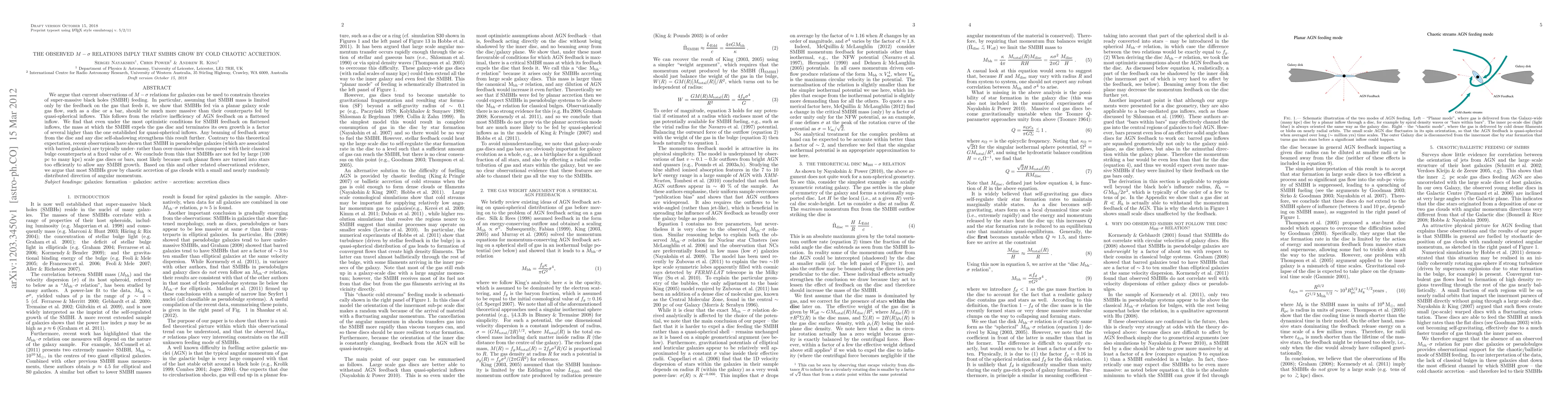 We argue that current observations of $M - \sigma$ relations for galaxies can be used to constrain theories of super-massive black holes (SMBH) feeding. In particular, assuming that SMBH mass is limited only by the feedback on the gas that feeds it, we show that SMBHs fed via a planar galaxy scale gas flow, such as a disc or a bar, should be much more massive than their counterparts fed by quasi-spherical inflows. This follows from the relative inefficiency of AGN feedback on a flattened inflow. We find that even under the most optimistic conditions for SMBH feedback on flattened inflows, the mass at which the SMBH expels the gas disc and terminates its own growth is a factor of several higher than the one established for quasi-spherical inflows. Any beaming of feedback away from the disc and any disc self-shadowing strengthens this result further. Contrary to this theoretical expectation, recent observations have shown that SMBH in pseudobulge galaxies (which are associated with barred galaxies) are typically under- rather than over-massive when compared with their classical bulge counterparts at a fixed value of $\sigma$. We conclude from this that SMBHs are not fed by large (100 pc to many kpc) scale gas discs or bars, most likely because such planar flows are turned into stars too efficiently to allow any SMBH growth. Based on this and other related observational evidence, we argue that most SMBHs grow by chaotic accretion of gas clouds with a small and nearly randomly distributed direction of angular momentum.