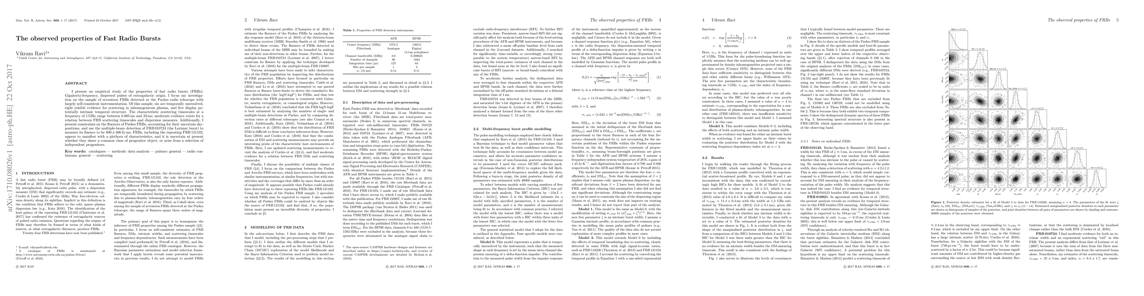 This paper investigates the properties of Fast Radio Bursts (FRBs), finding characteristic scattering timescales that range from 0.005 to 32 milliseconds, and constraints on their fluences. The results suggest FRBs may not share a common progenitor object, but rather arise from independent sources.