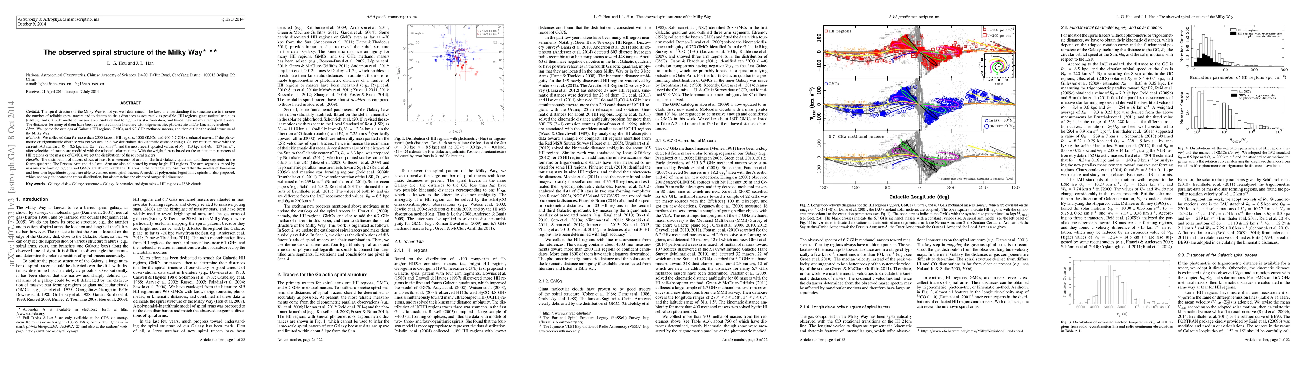 This paper updates catalogs of Galactic HII regions, GMCs, and methanol masers to determine the Milky Way's spiral structure, identifying at least four arms in the first quadrant and three in the fourth. The study proposes a polynomial-logarithmic spiral model that aligns with observed tangential directions and matches most tracers.