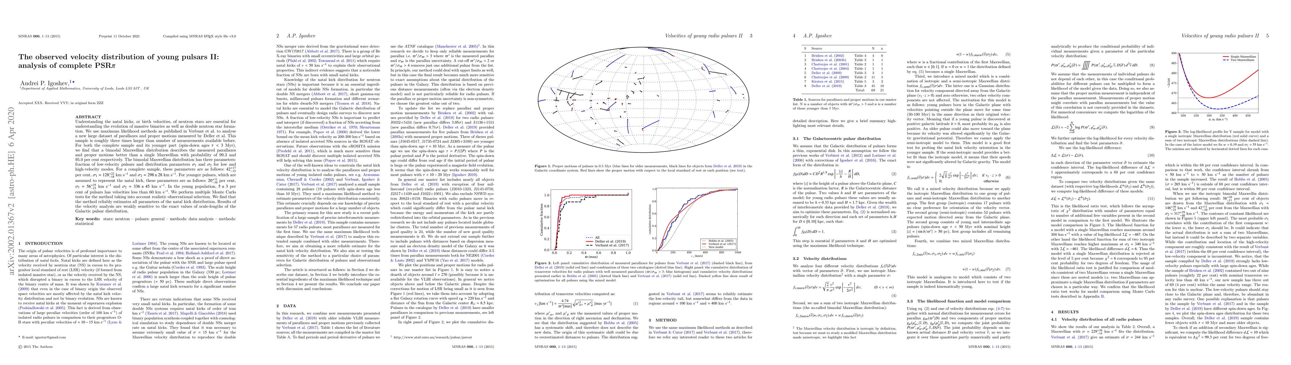 Understanding the natal kicks, or birth velocities, of neutron stars are essential for understanding the evolution of massive binaries as well as double neutron star formation. We use maximum likelihood methods as published in Verbunt et al. to analyse a new large dataset of parallaxes and proper motions measured by Deller et al. This sample is roughly three times larger than number of measurements available before. For both the complete sample and its younger part (spin-down ages $\tau < 3$ Myr), we find that a bimodal Maxwellian distribution describes the measured parallaxes and proper motions better than a single Maxwellian with probability of 99.3 and 95.0 per cent respectively. The bimodal Maxwellian distribution has three parameters: fraction of low-velocity pulsars and distribution parameters $\sigma_1$ and $\sigma_2$ for low and high-velocity modes. For a complete sample, these parameters are as follows: $42_{-15}^{+17}$ per cent, $\sigma_1=128_{-18}^{+22}$ km s$^{-1}$ and $\sigma_2 = 298\pm 28$ km s$^{-1}$. For younger pulsars, which are assumed to represent the natal kick, these parameters are as follows: $20_{-10}^{+11}$ per cent, $\sigma_1=56_{-15}^{+25}$ km s$^{-1}$ and $\sigma_2=336\pm 45$ km s$^{-1}$. In the young population, $5\pm 3$ per cent of pulsars has velocities less than 60 km s$^{-1}$. We perform multiple Monte Carlo tests for the method taking into account realistic observational selection. We find that the method reliably estimates all parameters of the natal kick distribution. Results of the velocity analysis are weakly sensitive to the exact values of scale-lengths of the Galactic pulsar distribution.