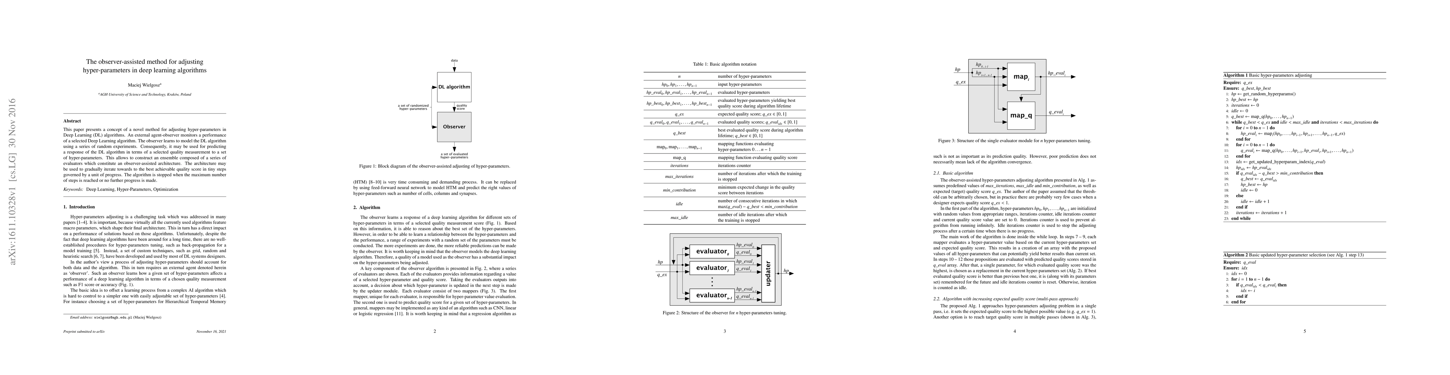This paper presents a concept of a novel method for adjusting hyper-parameters in Deep Learning (DL) algorithms. An external agent-observer monitors a performance of a selected Deep Learning algorithm. The observer learns to model the DL algorithm using a series of random experiments. Consequently, it may be used for predicting a response of the DL algorithm in terms of a selected quality measurement to a set of hyper-parameters. This allows to construct an ensemble composed of a series of evaluators which constitute an observer-assisted architecture. The architecture may be used to gradually iterate towards to the best achievable quality score in tiny steps governed by a unit of progress. The algorithm is stopped when the maximum number of steps is reached or no further progress is made.
