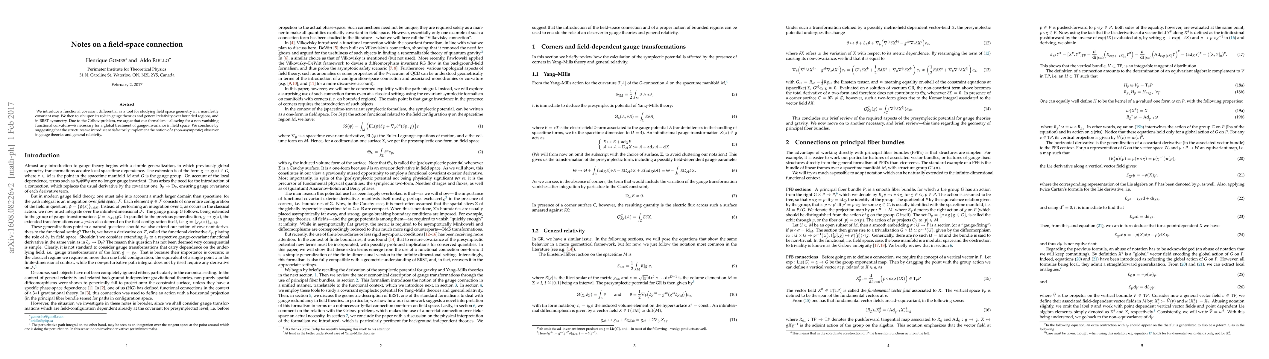 We introduce a functional covariant differential as a tool for studying field space geometry in a manifestly covariant way. We then touch upon its role in gauge theories and general relativity over bounded regions, and in BRST symmetry. Due to the Gribov problem, we argue that our formalism ---allowing for a non-vanishing functional curvature---is necessary for a global treatment of gauge-invariance in field space. We conclude by suggesting that the structures we introduce satisfactorily implement the notion of a (non-asymptotic) observer in gauge theories and general relativity.