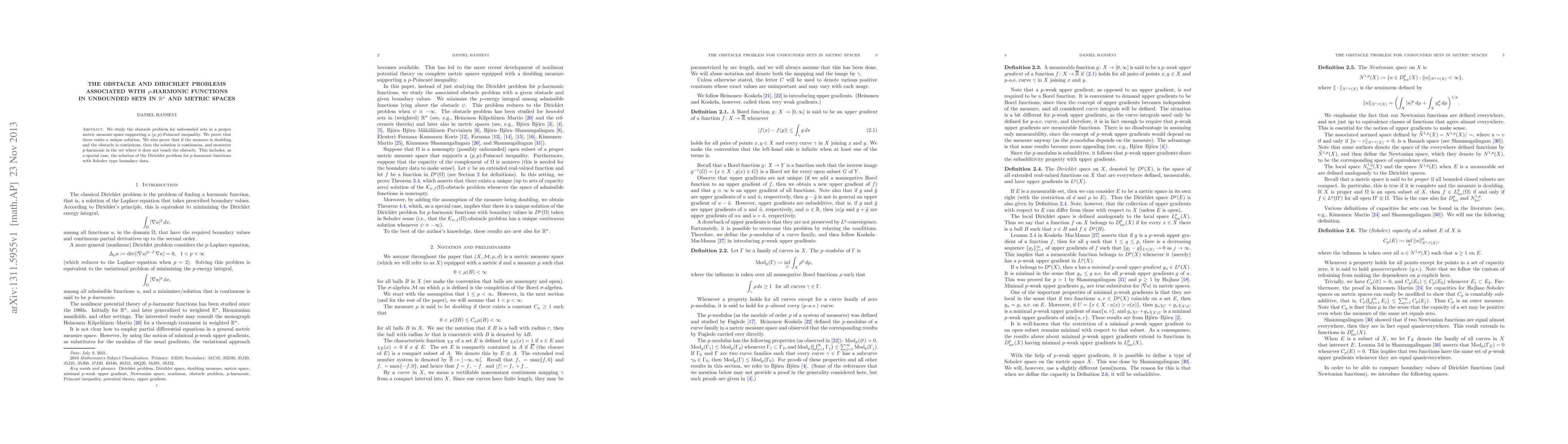 This paper investigates the obstacle problem for p-harmonic functions in unbounded sets in proper metric measure spaces, proving the existence and uniqueness of solutions. It further demonstrates that under doubling measure and continuous obstacle conditions, the solution is continuous and p-harmonic where it does not touch the obstacle, thereby addressing the Dirichlet problem for p-harmonic functions with Sobolev boundary data.