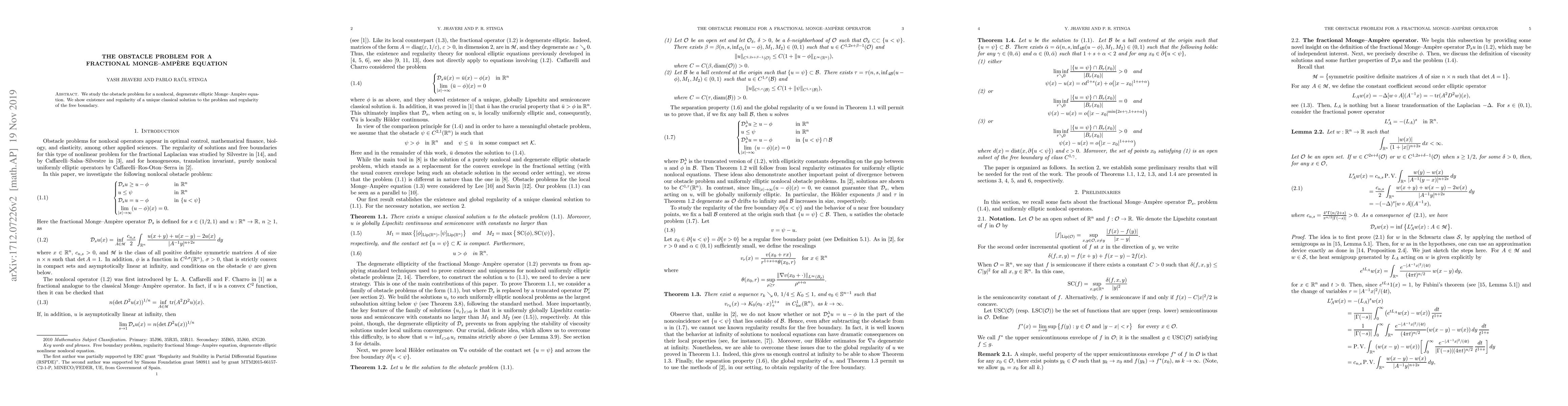 Summary: This paper investigates the obstacle problem for a nonlocal fractional Monge-Ampère equation, proving the existence, uniqueness, and regularity of classical solutions, along with the regularity of the associated free boundary.