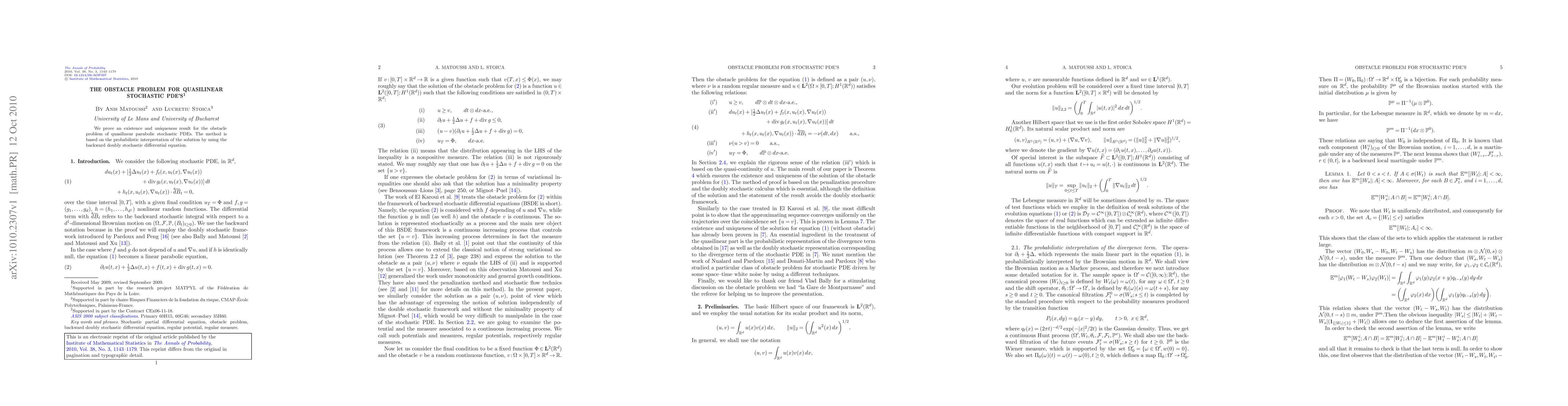 Summary: This paper establishes existence and uniqueness for the obstacle problem in quasilinear stochastic PDEs, employing a probabilistic approach via backward doubly stochastic differential equations. The method provides a robust framework for solving these complex stochastic equations.