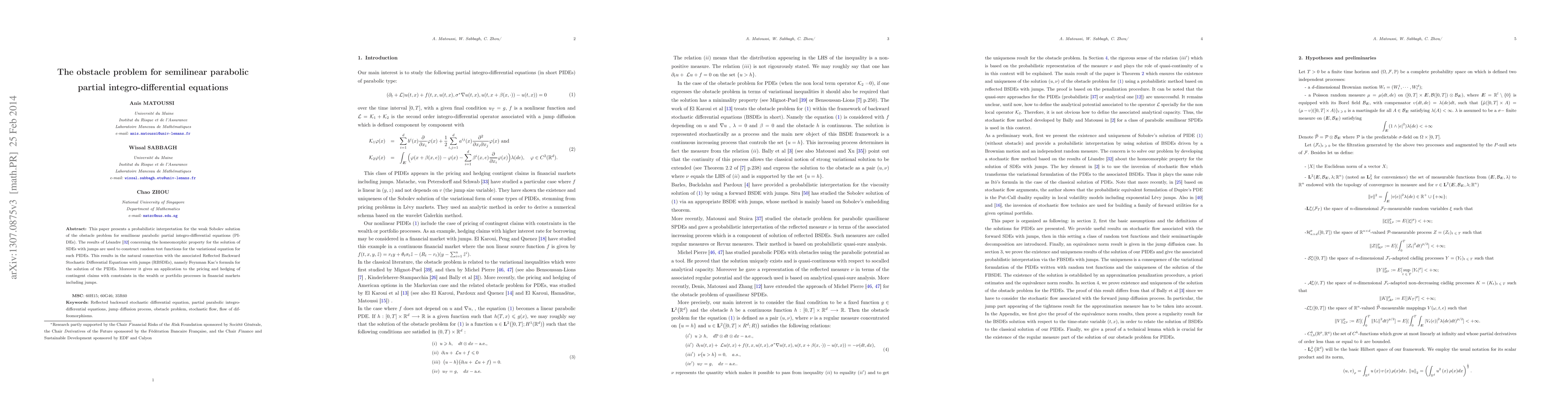 This paper provides a probabilistic interpretation for the weak Sobolev solution of the obstacle problem in semilinear parabolic partial integro-differential equations (PIDEs), leveraging results from stochastic differential equations with jumps to construct random test functions. It connects the PIDEs to Reflected Backward Stochastic Differential Equations with jumps, with applications in financial markets for pricing and hedging contingent claims with constraints.