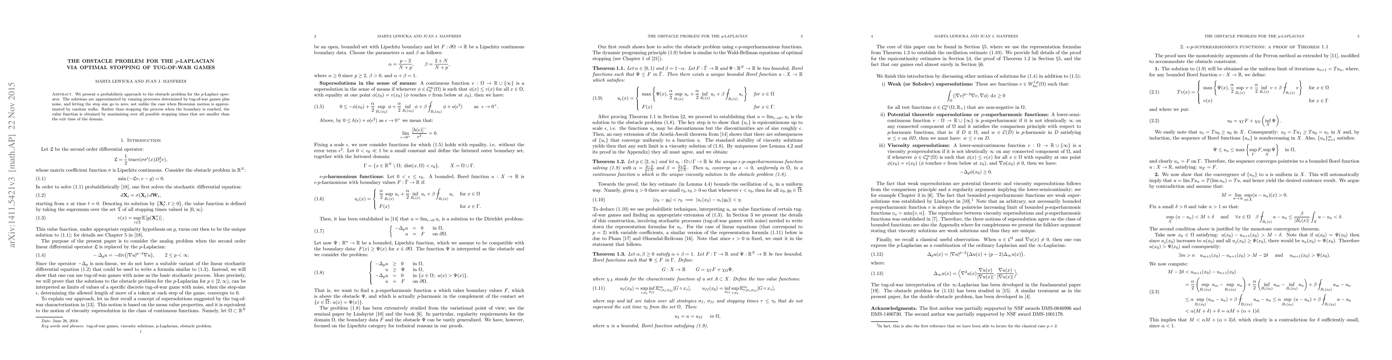We present a probabilistic approach to the obstacle problem for for the $p$-Laplace operator. The solutions are approximated by running processes determined by tug-of-war games plus noise, and letting the step size go to zero, not unlike the case when Brownian motion is approximated by random walks. Rather than stopping the process when the boundary is reached, the value function is obtained by maximizing over all possible stopping times that are smaller than the exit time of the domain.