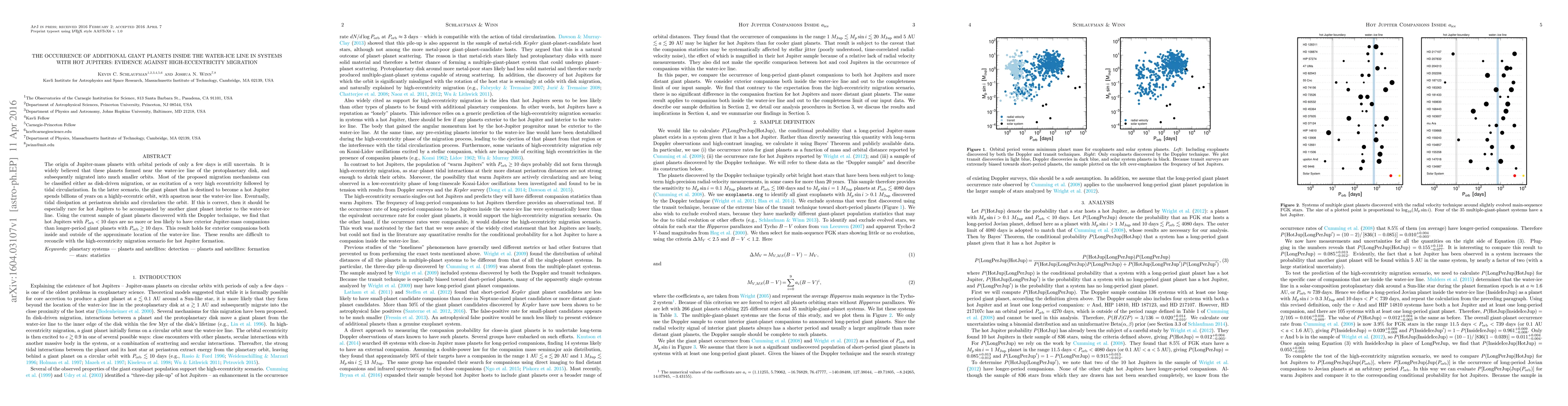 The origin of Jupiter-mass planets with orbital periods of only a few days is still uncertain. It is widely believed that these planets formed near the water-ice line of the protoplanetary disk, and subsequently migrated into much smaller orbits. Most of the proposed migration mechanisms can be classified either as disk-driven migration, or as excitation of a very high eccentricity followed by tidal circularization. In the latter scenario, the giant planet that is destined to become a hot Jupiter spends billions of years on a highly-eccentric orbit, with apastron near the water-ice line. Eventually, tidal dissipation at periastron shrinks and circularizes the orbit. If this is correct, then it should be especially rare for hot Jupiters to be accompanied by another giant planet interior to the water-ice line. Using the current sample of giant planets discovered with the Doppler technique, we find that hot Jupiters with P_orb < 10 days are no more or less likely to have exterior Jupiter-mass companions than longer-period giant planets with P_orb >= 10 days. This result holds for exterior companions both inside and outside of the approximate location of the water-ice line. These results are difficult to reconcile with the high-eccentricity migration scenario for hot Jupiter formation.