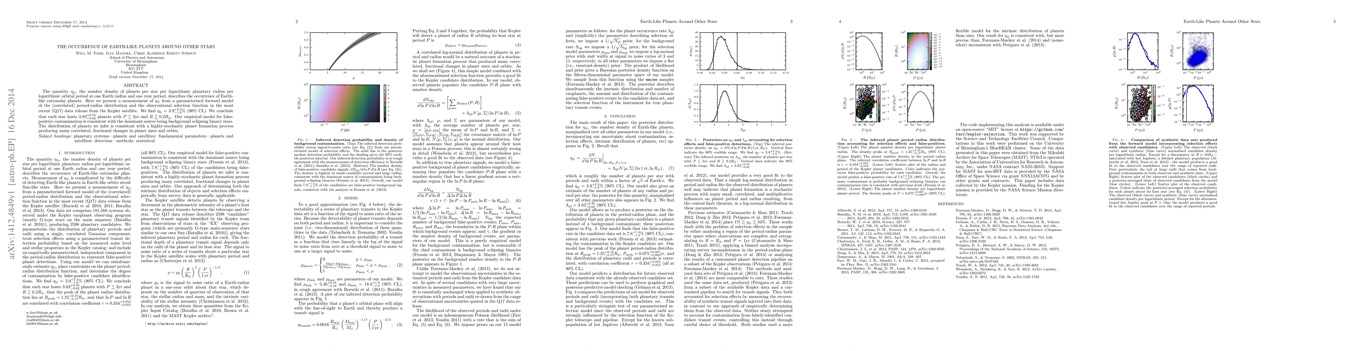 This study estimates the occurrence rate of Earth-like planets around other stars to be $\eta_\oplus = 3.9_{-1.6}^{+2.2}\%$ (90% CL), suggesting each star hosts about 3.83 such planets, based on Kepler satellite data. The findings indicate a stochastic planet formation process and background eclipsing binaries as the main source of false positives.