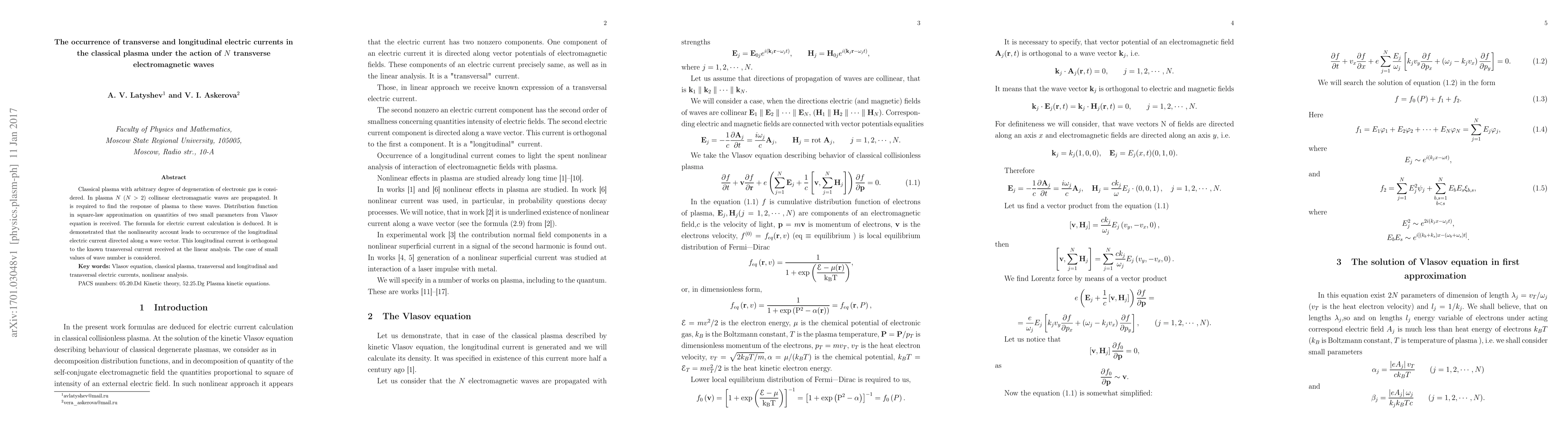 Classical plasma with arbitrary degree of degeneration of electronic gas is considered. In plasma N (N>2) collinear electromagnatic waves are propagated. It is required to find the response of plasma to these waves. Distribution function in square-law approximation on quantities of two small parameters from Vlasov equation is received. The formula for electric current calculation is deduced. It is demonstrated that the nonlinearity account leads to occurrence of the longitudinal electric current directed along a wave vector. This longitudinal current is orthogonal to the known transversal current received at the linear analysis. The case of small values of wave number is considered.
