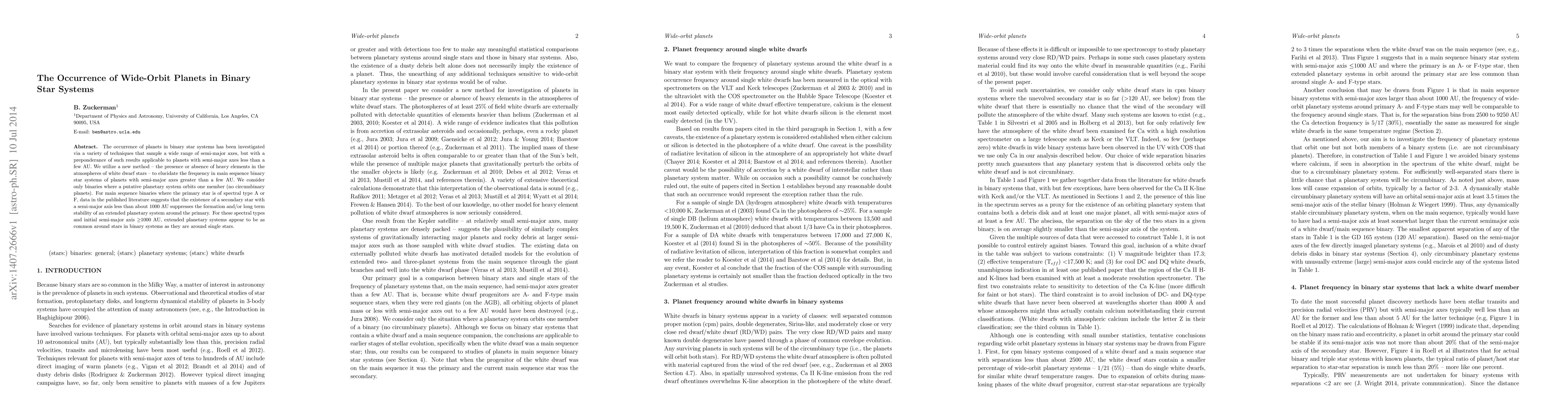 The occurrence of planets in binary star systems has been investigated via a variety of techniques that sample a wide range of semi-major axes, but with a preponderance of such results applicable to planets with semi-major axes less than a few AU. We utilize a new method -- the presence or absence of heavy elements in the atmospheres of white dwarf stars -- to elucidate the frequency in main sequence binary star systems of planets with semi-major axes greater than a few AU. We consider only binaries where a putative planetary system orbits one member (no circumbinary planets). For main sequence binaries where the primary star is of spectral type A or F, data in the published literature suggests that the existence of a secondary star with a semi-major axis less than about 1000 AU suppresses the formation and/or long term stability of an extended planetary system around the primary. For these spectral types and initial semi-major axis $\geq$1000 AU, extended planetary systems appear to be as common around stars in binary systems as they are around single stars.