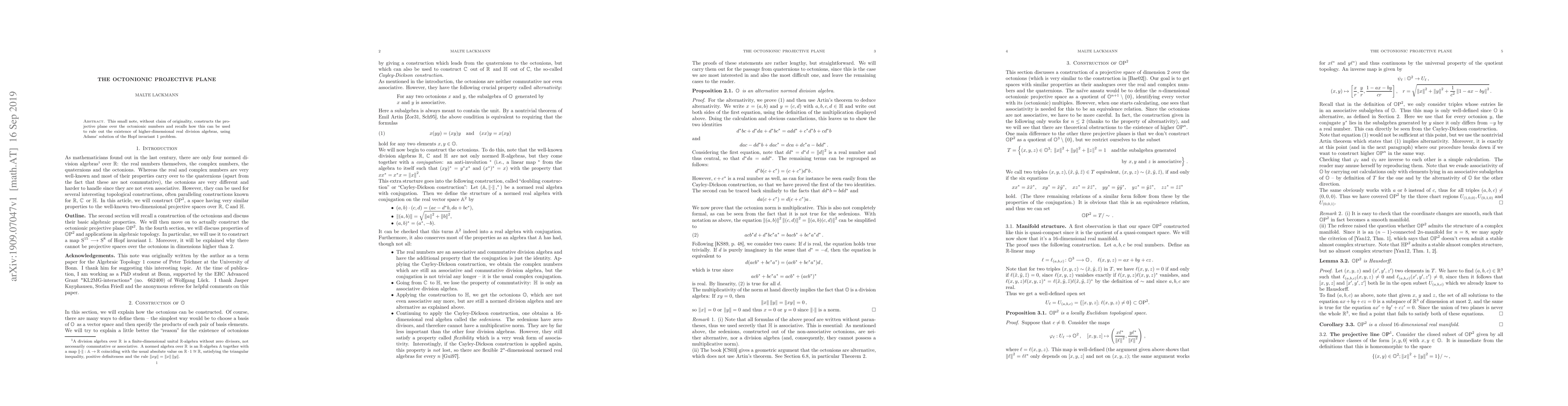 Summary: This paper constructs the projective plane over octonionic numbers and utilizes Adams' solution to the Hopf invariant 1 problem to demonstrate the non-existence of higher-dimensional real division algebras. The construction serves as a theoretical tool in algebraic topology.