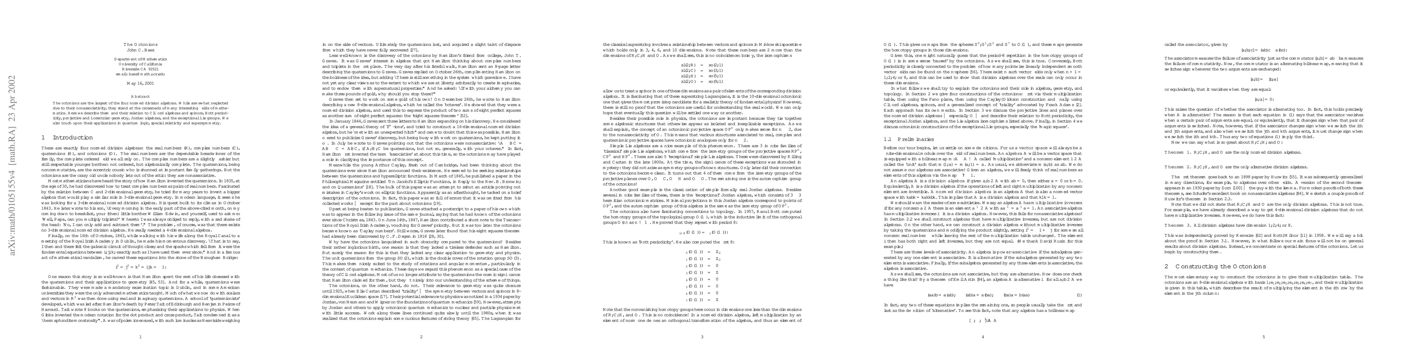 The octonions are a normed division algebra that plays a crucial role in various fields of mathematics, including geometry, Lie groups, and quantum logic, offering insights into concepts like Clifford algebras, spinors, and special relativity.