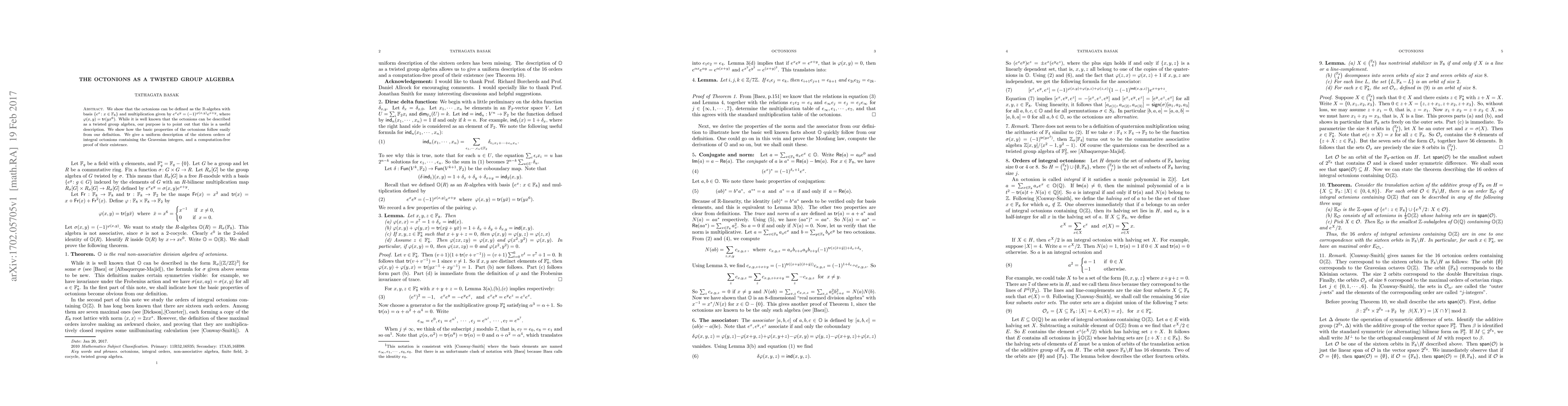 The paper presents the octonions as a twisted group algebra with a basis derived from $\mathbb{F}_8$ and demonstrates how their properties naturally follow from this definition, providing a uniform description of their integral orders.