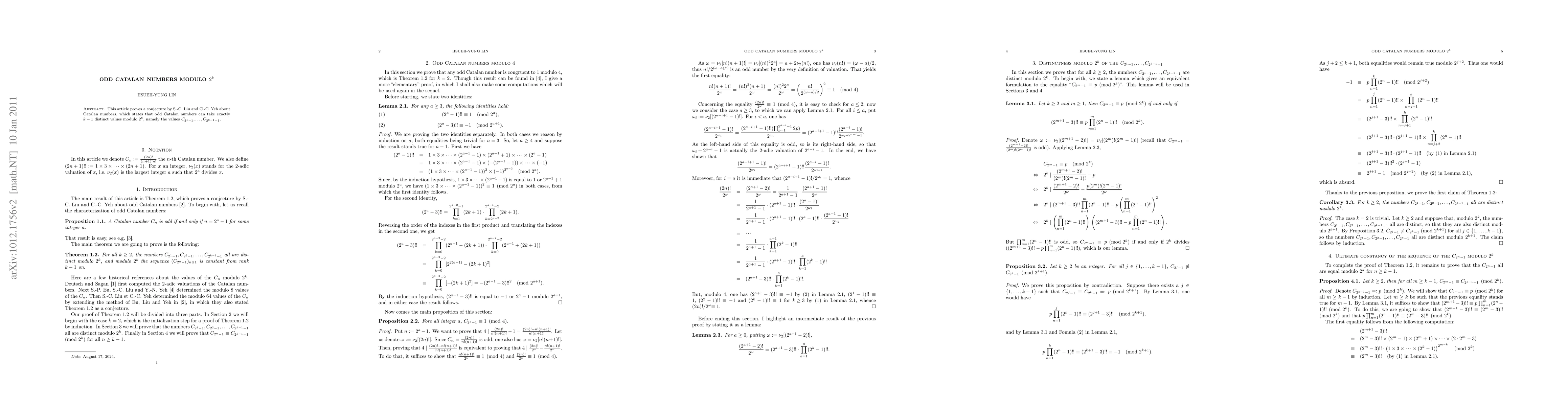 This paper investigates the congruence properties of odd Catalan numbers modulo powers of 2, demonstrating that only k - 1 distinct congruences exist for k >= 2, which can be derived from C_{2^m - 1} (mod 2^k) for m = 1 to k - 1.