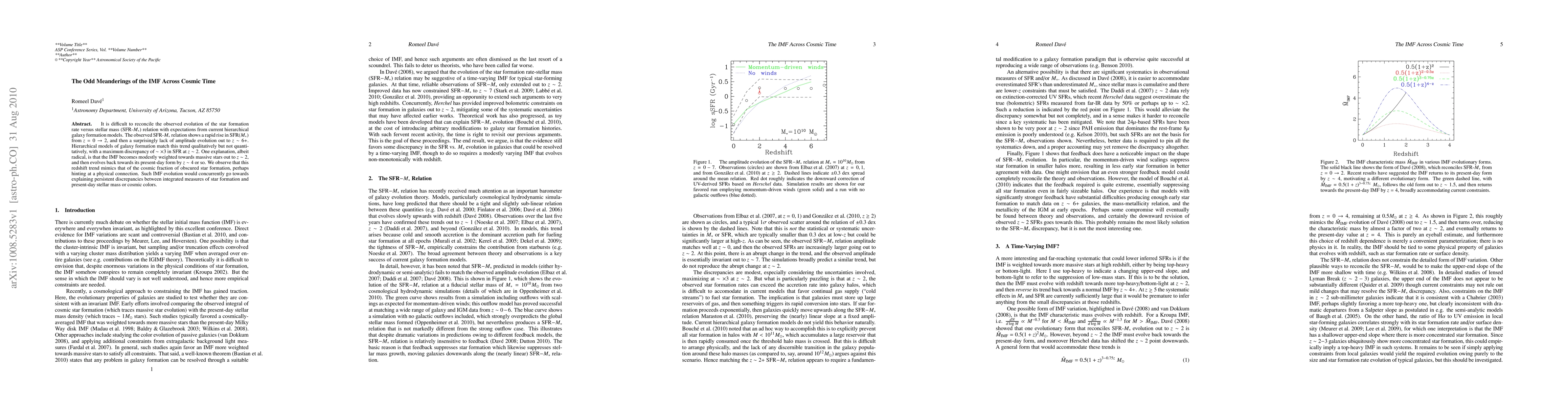 It is difficult to reconcile the observed evolution of the star formation rate versus stellar mass (SFR-M*) relation with expectations from current hierarchical galaxy formation models. The observed SFR-M* relation shows a rapid rise in SFR(M*) from z=0-2, and then a surprisingly lack of amplitude evolution out to z~6+. Hierarchical models of galaxy formation match this trend qualitatively but not quantitatively, with a maximum discrepancy of ~x3 in SFR at z~2. One explanation, albeit radical, is that the IMF becomes modestly weighted towards massive stars out to z~2, and then evolves back towards its present-day form by z~4 or so. We observe that this redshift trend mimics that of the cosmic fraction of obscured star formation, perhaps hinting at a physical connection. Such IMF evolution would concurrently go towards explaining persistent discrepancies between integrated measures of star formation and present-day stellar mass or cosmic colors.