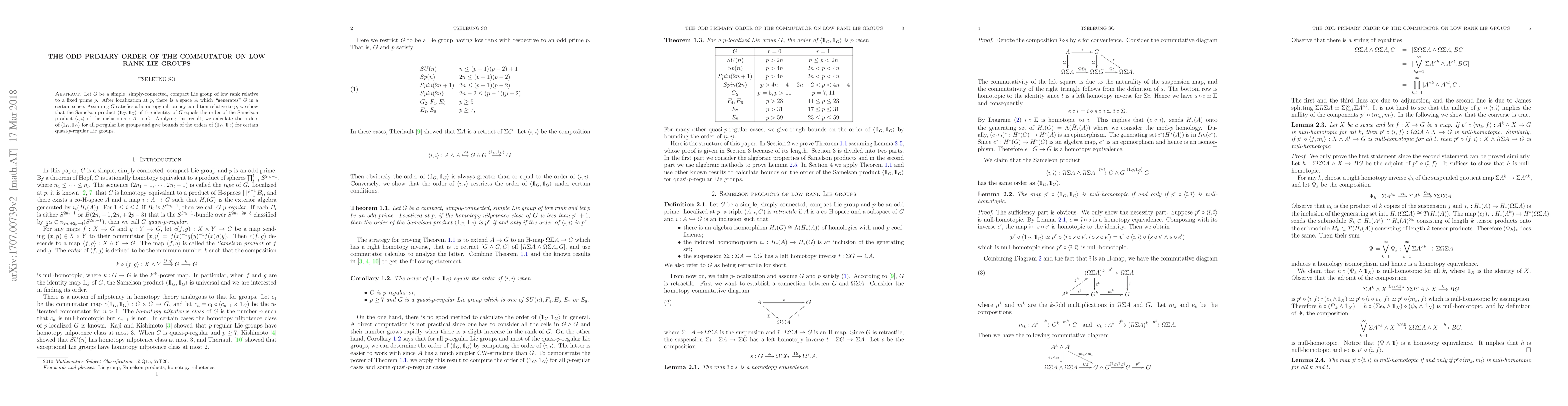 This paper investigates the primary order of the commutator (Samelson product) in simply-connected, compact, simple Lie groups of low rank relative to a fixed prime $p$. It demonstrates that the Samelson product of the identity equals the order of the Samelson product of the inclusion of a generating space $A$ localized at $p$, and provides bounds for $p$-regular and quasi-$p$-regular Lie groups.