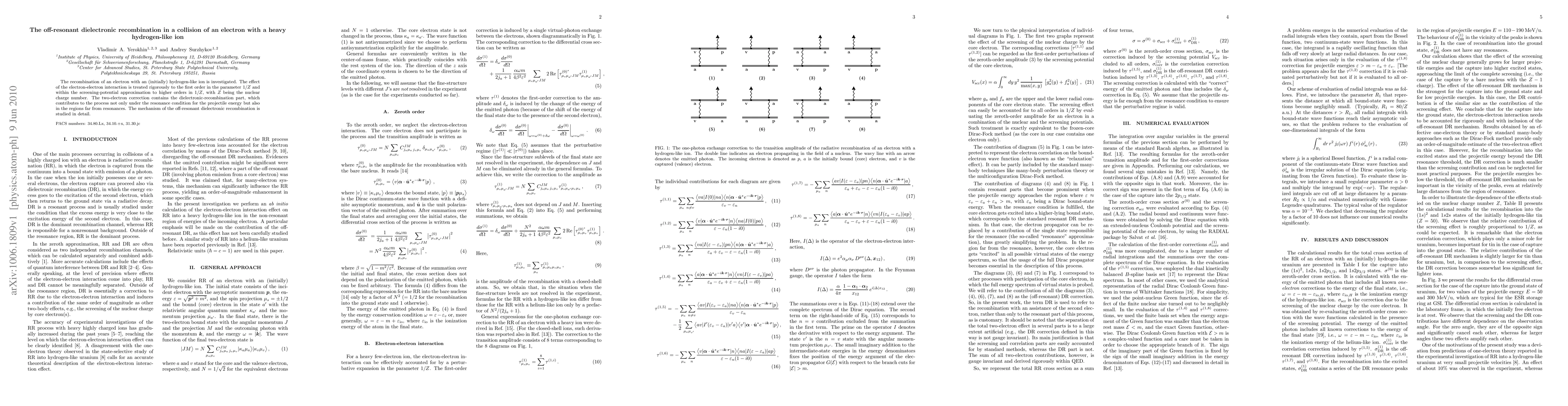 This paper investigates electron-heavy ion recombination, focusing on the off-resonant dielectronic recombination process. It rigorously treats electron-electron interactions and explores the mechanism contributing to recombination even outside resonance conditions.