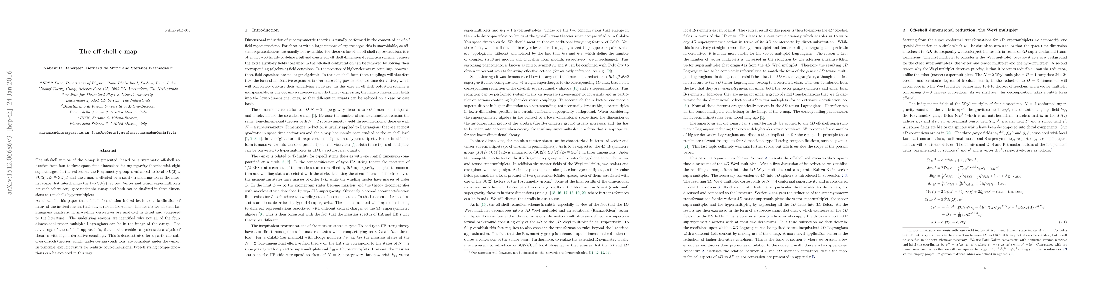 This paper presents the off-shell version of the c-map, systematically reducing supergravity theories from four to three dimensions, enhancing the R-symmetry group, and dualizing vector and tensor supermultiplets to hypermultiplets. The off-shell approach clarifies intricate issues and enables the analysis of higher-derivative couplings in string compactifications.