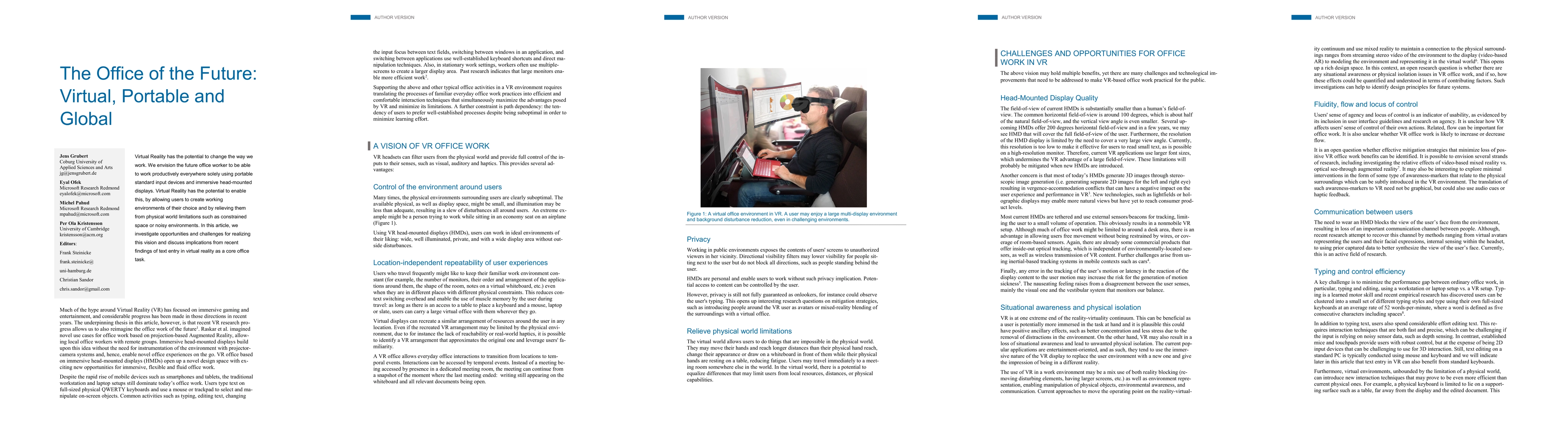 This paper explores the transformative potential of virtual reality (VR) in redefining the future office, proposing a vision where workers use portable devices and immersive VR headsets to create flexible, space-independent work environments. It examines the challenges and opportunities in achieving this vision, particularly focusing on recent findings regarding text entry in VR.