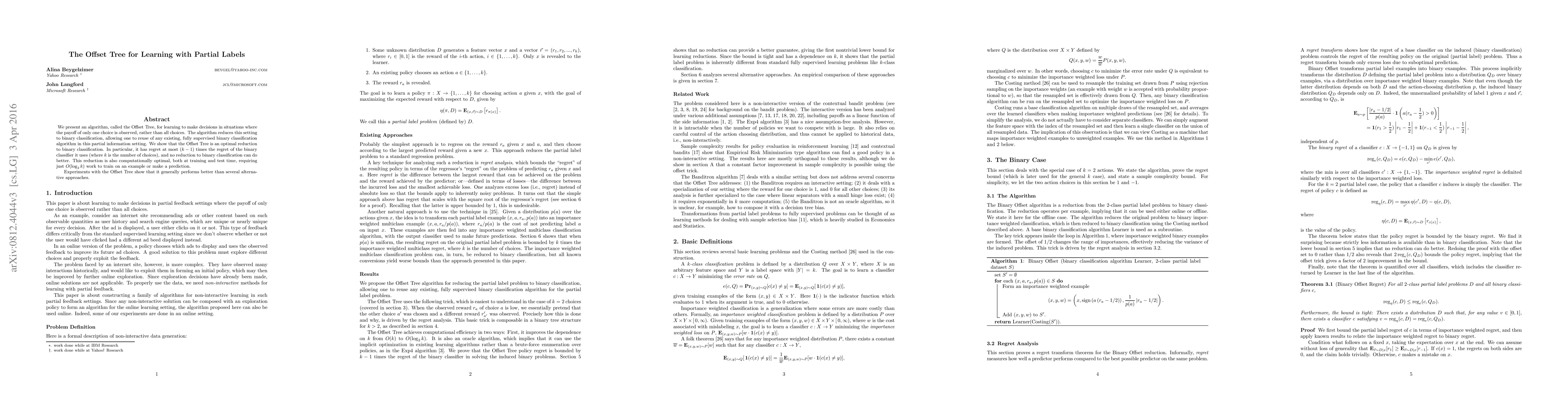 We present an algorithm, called the Offset Tree, for learning to make decisions in situations where the payoff of only one choice is observed, rather than all choices. The algorithm reduces this setting to binary classification, allowing one to reuse of any existing, fully supervised binary classification algorithm in this partial information setting. We show that the Offset Tree is an optimal reduction to binary classification. In particular, it has regret at most $(k-1)$ times the regret of the binary classifier it uses (where $k$ is the number of choices), and no reduction to binary classification can do better. This reduction is also computationally optimal, both at training and test time, requiring just $O(\log_2 k)$ work to train on an example or make a prediction. Experiments with the Offset Tree show that it generally performs better than several alternative approaches.