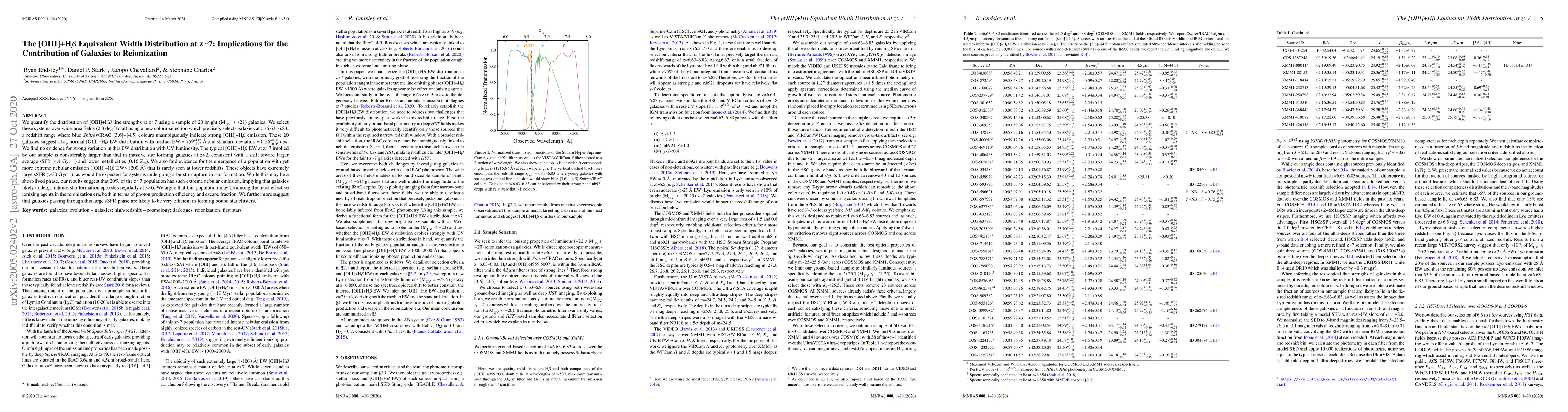 This paper investigates the [OIII]+H$\beta$ equivalent width distribution in 20 bright galaxies at z$\simeq$7, finding a log-normal distribution indicative of high star formation rates and lower metallicities. The study suggests that galaxies with extreme nebular emission may play a significant role in reionization due to their high photon production efficiency.