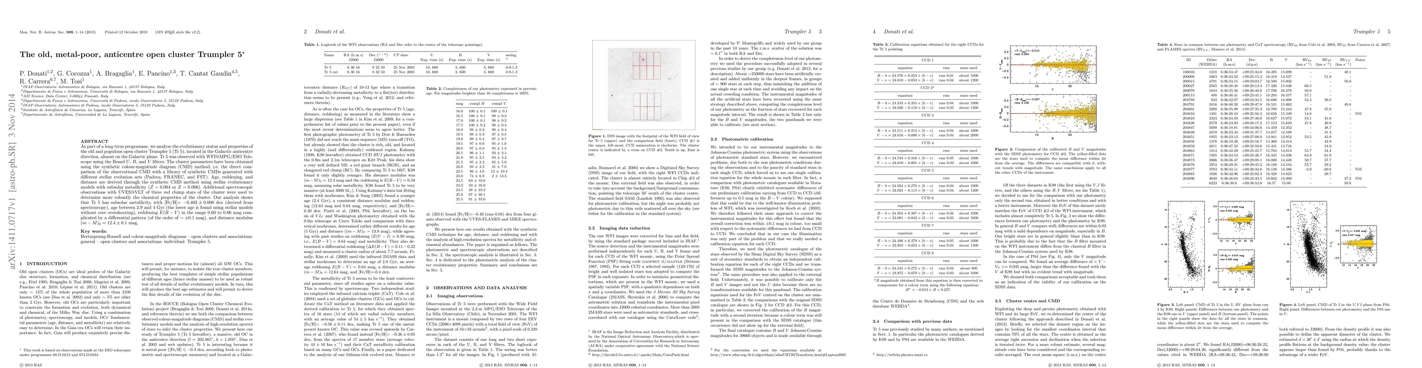 The study of the old, metal-poor open cluster Trumpler 5 (Tr 5) in the Galactic anticentre reveals an age between 2.9 and 4 Gyr, subsolar metallicity of [Fe/H]= -0.403±0.006 dex, and a distance modulus of (m-M)_0=12.4±0.1 mag. The analysis combines synthetic colour-magnitude diagrams and spectroscopic observations of red clump stars.