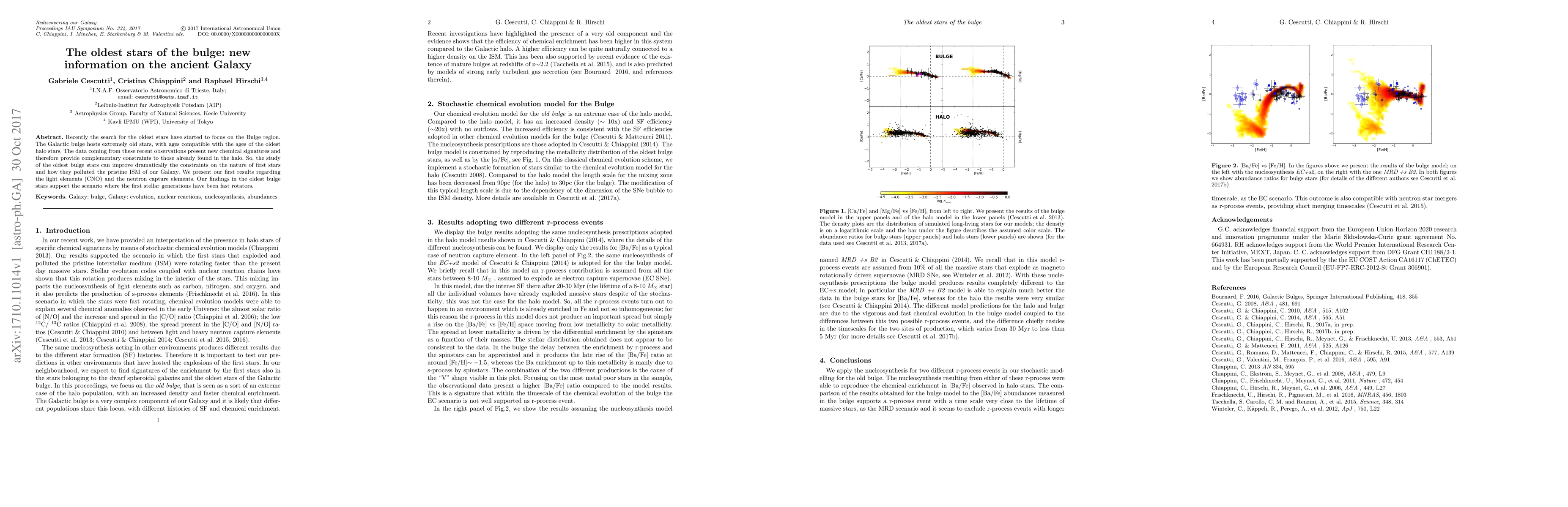 Recently the search for the oldest stars have started to focus on the Bulge region. The Galactic bulge hosts extremely old stars, with ages compatible with the ages of the oldest halo stars. The data coming from these recent observations present new chemical signatures and therefore provide complementary constraints to those already found in the halo. So, the study of the oldest bulge stars can improve dramatically the constraints on the nature of first stars and how they polluted the pristine ISM of our Galaxy. We present our first results regarding the light elements (CNO) and the neutron capture elements. Our findings in the oldest bulge stars support the scenario where the first stellar generations have been fast rotators.