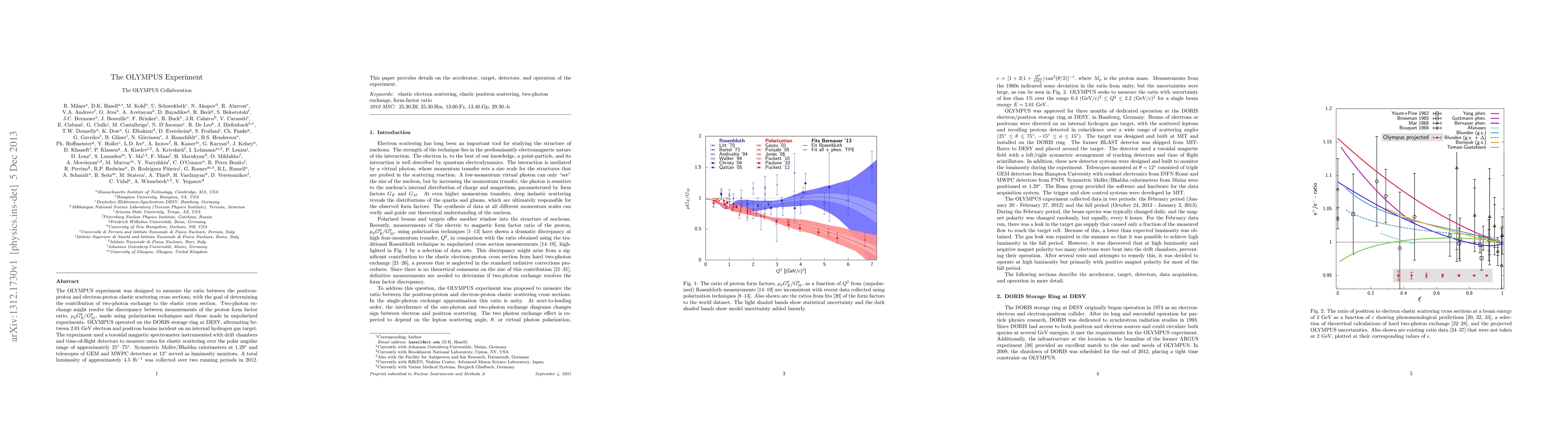 The OLYMPUS experiment measured elastic scattering cross sections to determine two-photon exchange's contribution to proton form factor ratio discrepancies. A total luminosity of approximately 4.5 fb$^{-1}$ was collected over two running periods in 2012.