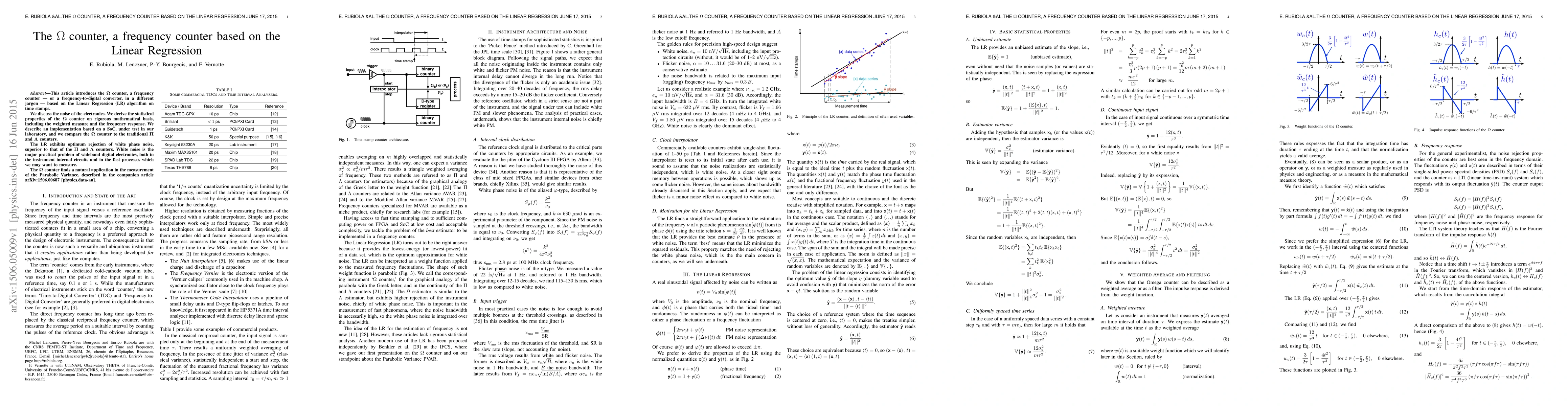 This article introduces the {\Omega} counter, a frequency counter -- or a frequency-to-digital converter, in a different jargon -- based on the Linear Regression (LR) algorithm on time stamps. We discuss the noise of the electronics. We derive the statistical properties of the {\Omega} counter on rigorous mathematical basis, including the weighted measure and the frequency response. We describe an implementation based on a SoC, under test in our laboratory, and we compare the {\Omega} counter to the traditional {\Pi} and {\Lambda} counters. The LR exhibits optimum rejection of white phase noise, superior to that of the {\Pi} and {\Lambda} counters. White noise is the major practical problem of wideband digital electronics, both in the instrument internal circuits and in the fast processes which we may want to measure. The {\Omega} counter finds a natural application in the measurement of the Parabolic Variance, described in the companion article arXiv:1506.00687 [physics.data-an].