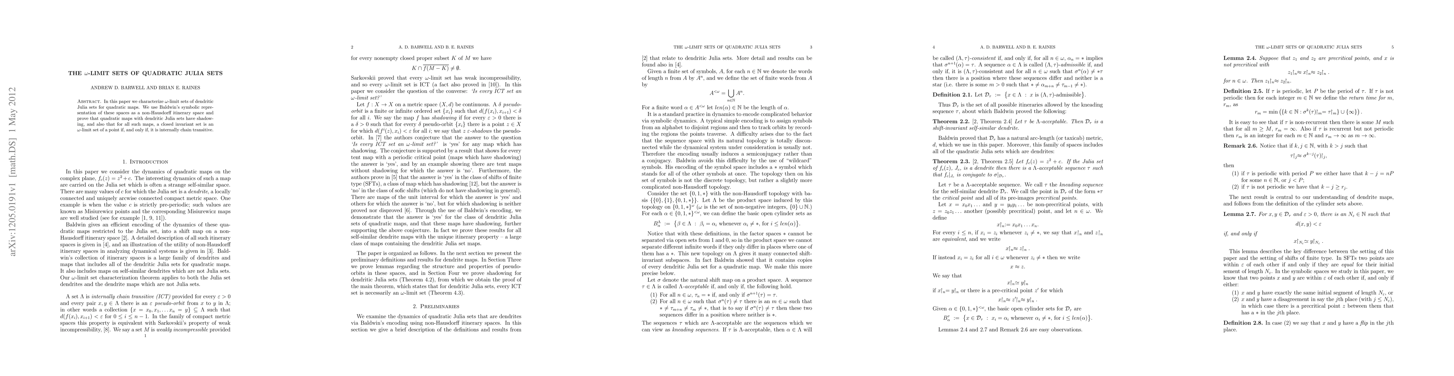 The paper characterizes the omega-limit sets of dendritic Julia sets for quadratic maps using Baldwin's symbolic representation of these spaces as a non-Hausdorff itinerary space.