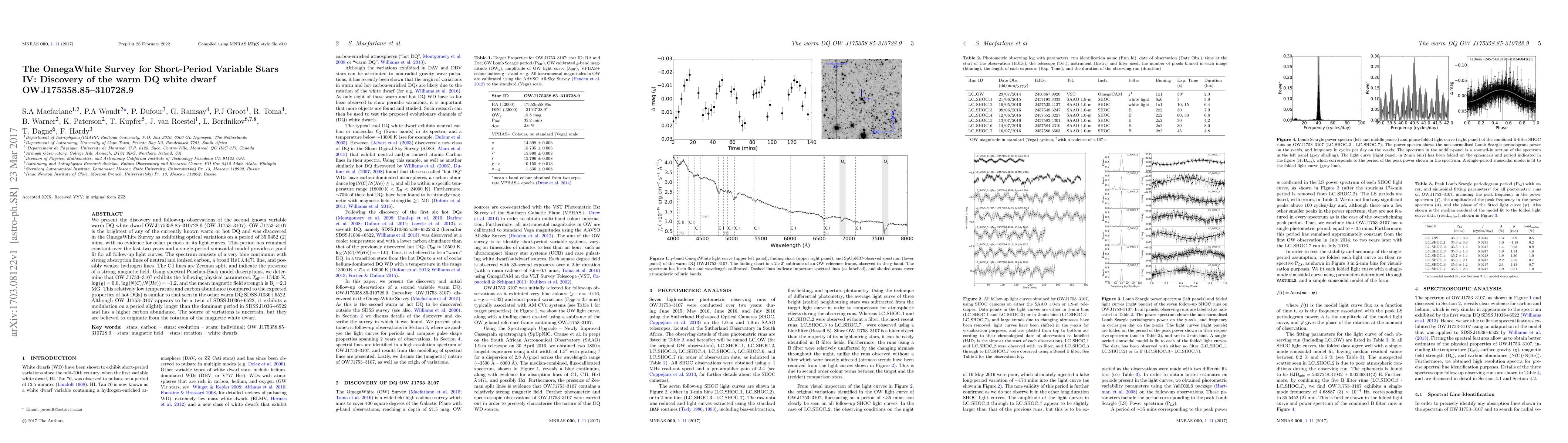 The OmegaWhite Survey discovered OW J1753-3107, the brightest warm DQ white dwarf with optical variations on a 35.5452-minute period. It exhibits a strong magnetic field and unique spectral characteristics, suggesting a relatively low temperature and carbon abundance.