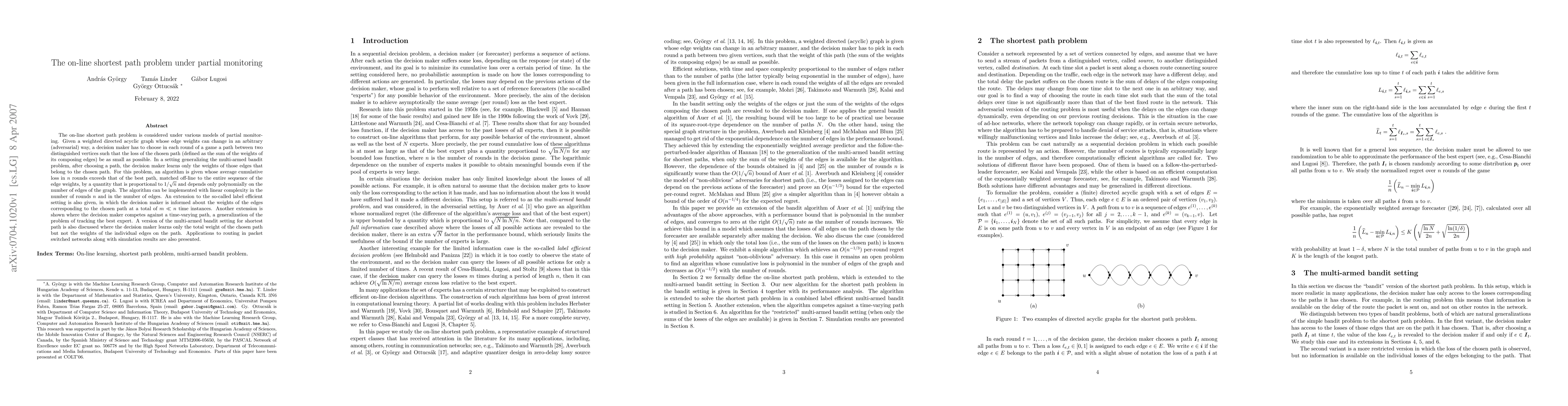 The on-line shortest path problem is considered under various models of partial monitoring. Given a weighted directed acyclic graph whose edge weights can change in an arbitrary (adversarial) way, a decision maker has to choose in each round of a game a path between two distinguished vertices such that the loss of the chosen path (defined as the sum of the weights of its composing edges) be as small as possible. In a setting generalizing the multi-armed bandit problem, after choosing a path, the decision maker learns only the weights of those edges that belong to the chosen path. For this problem, an algorithm is given whose average cumulative loss in n rounds exceeds that of the best path, matched off-line to the entire sequence of the edge weights, by a quantity that is proportional to 1/\sqrt{n} and depends only polynomially on the number of edges of the graph. The algorithm can be implemented with linear complexity in the number of rounds n and in the number of edges. An extension to the so-called label efficient setting is also given, in which the decision maker is informed about the weights of the edges corresponding to the chosen path at a total of m << n time instances. Another extension is shown where the decision maker competes against a time-varying path, a generalization of the problem of tracking the best expert. A version of the multi-armed bandit setting for shortest path is also discussed where the decision maker learns only the total weight of the chosen path but not the weights of the individual edges on the path. Applications to routing in packet switched networks along with simulation results are also presented.