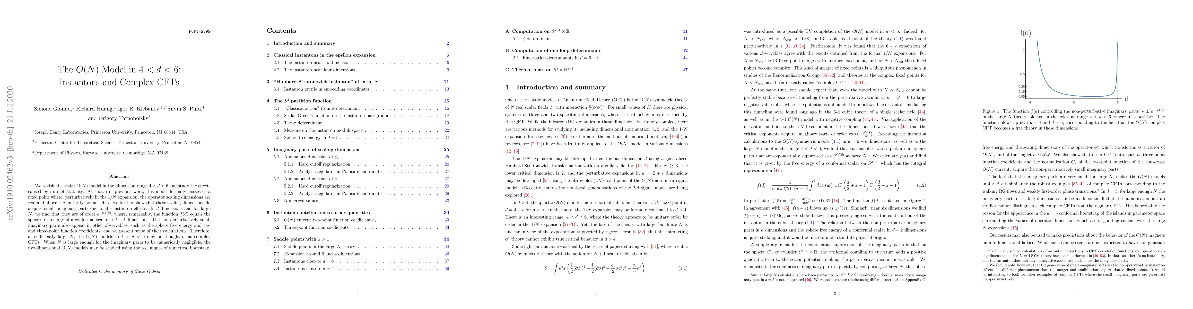 This paper examines the $O(N)$ model in dimensions $4<d<6$, revealing that instanton effects introduce small imaginary parts to the scaling dimensions and other observables, leading to the notion of the model as a complex conformal field theory (CFT) at large $N$. The magnitude of these imaginary parts is shown to relate to the sphere free energy of a conformal scalar in $d-2$ dimensions.