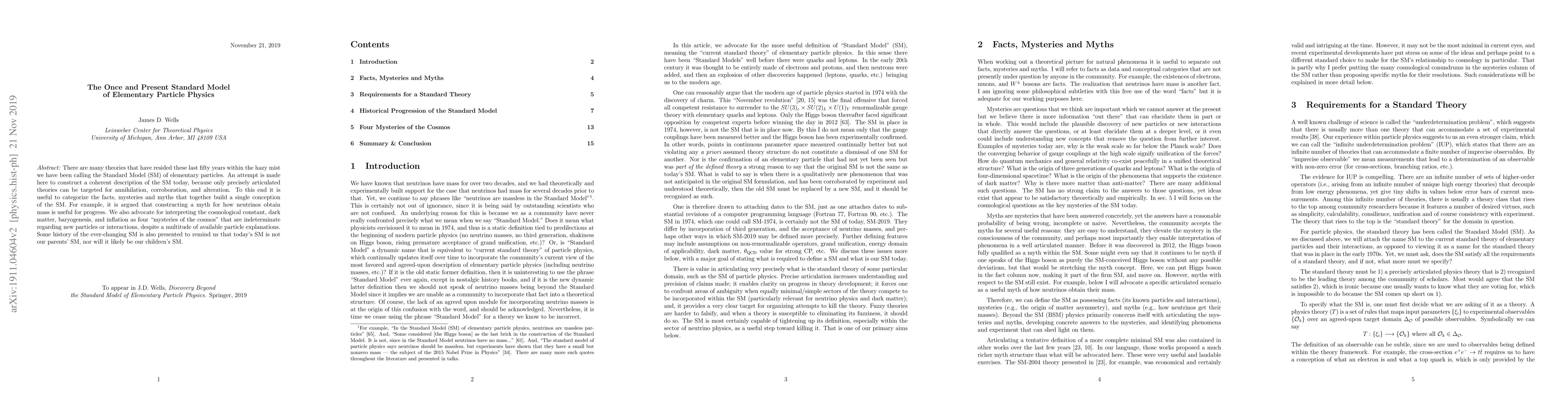 There are many theories that have resided these last fifty years within the hazy mist we have been calling the Standard Model (SM) of elementary particles. An attempt is made here to construct a coherent description of the SM today, because only precisely articulated theories can be targeted for annihilation, corroboration, and alteration. To this end it is useful to categorize the facts, mysteries and myths that together build a single conception of the SM. For example, it is argued that constructing a myth for how neutrinos obtain mass is useful for progress. We also advocate for interpreting the cosmological constant, dark matter, baryogenesis, and inflation as four "mysteries of the cosmos" that are indeterminate regarding new particles or interactions, despite a multitude of available particle explanations. Some history of the ever-changing SM is also presented to remind us that today's SM is not our parents' SM, nor will it likely be our children's SM.