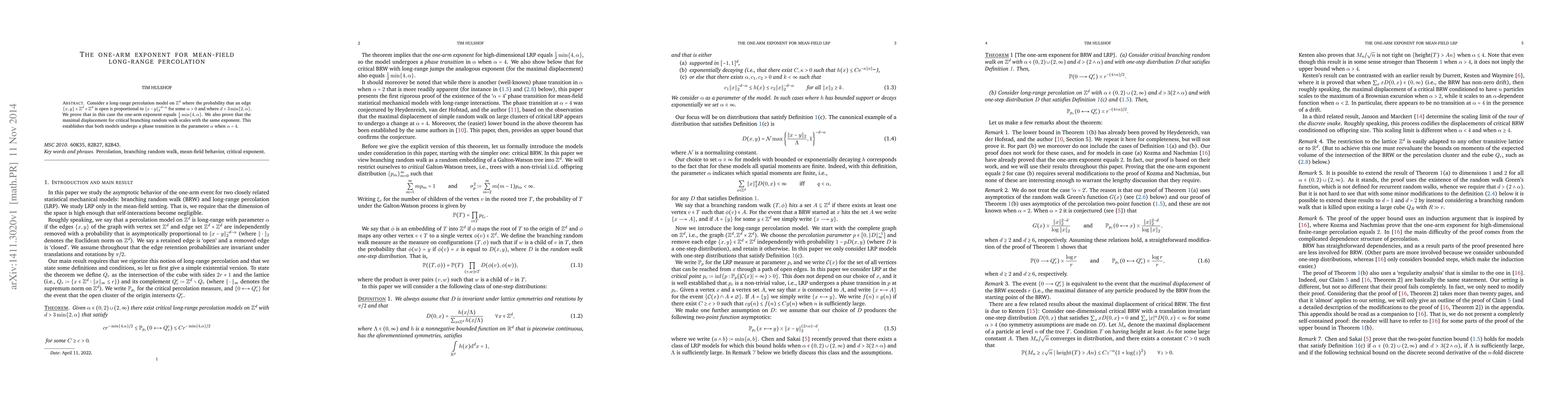 This paper investigates mean-field long-range percolation in $\mathbb{Z}^d$, proving that the one-arm exponent equals $\min\{4,\alpha\}/2$ and that critical branching random walk scales similarly, indicating a phase transition at $\alpha = 4$.